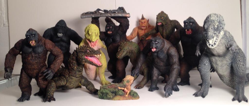 Gorilla 4, green T. Rex from original Kong, Gorilla 1 toward the back in gray scale,
