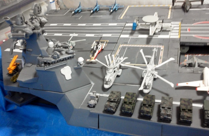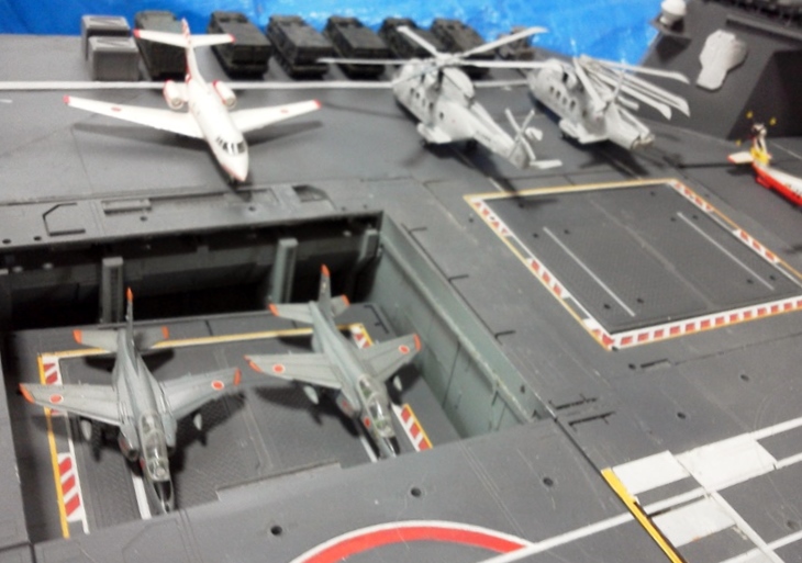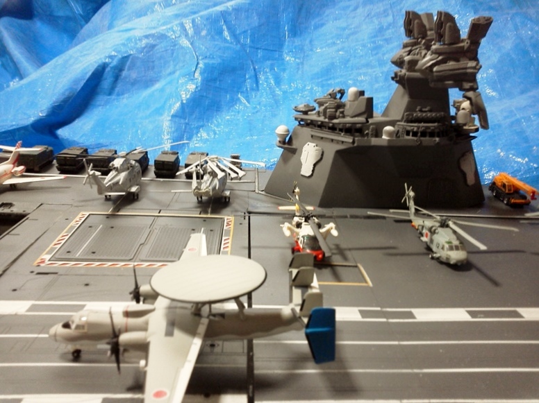 こちらは現用機搭載仕様でもあまり違和感がないので、何とか87式自走高射機関砲(通称ハエ叩き)や96式多目的誘導弾システム、地対艦誘導弾等の車両と一緒に甲板に配置したかったが、疲れたので本日断念。