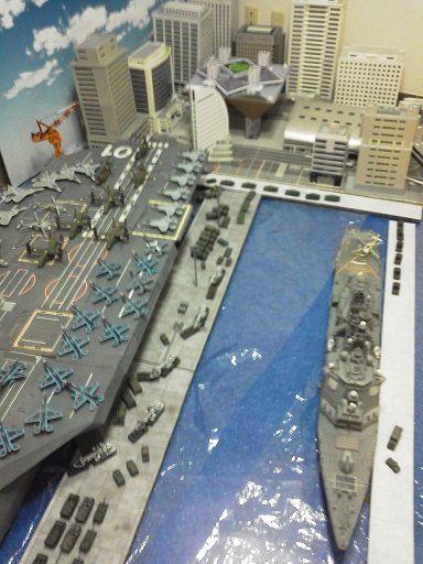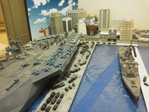ダンボールからビルを出したら、少し淋しかった空母と護衛艦を取り囲んで、あっという間に港町に変化したのは驚きでした!