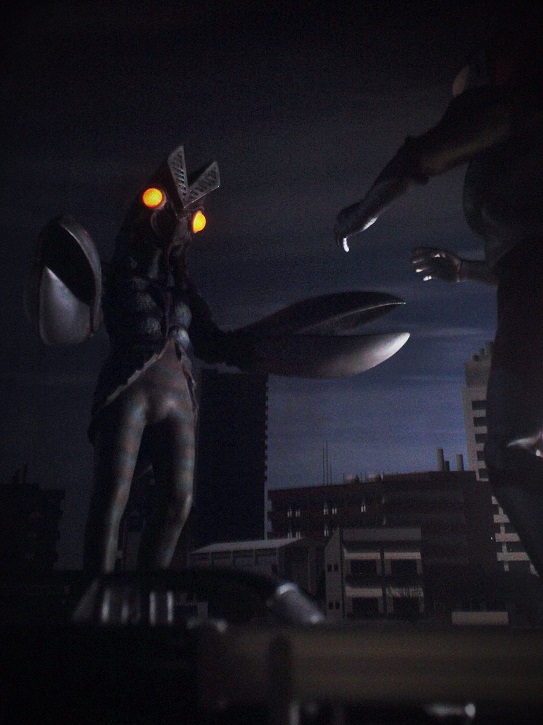 BOSS様、お久しぶりです!バルタン星人&ウルトラマン最高です!暗闇の中に光る両者の目、そして微かに見える青いカラータイマー!テレビで見ている場面をそのまま再現しています。また背景が入っているので臨場感が抜群です!