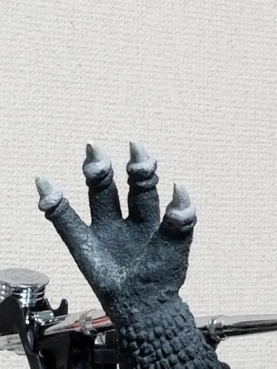 やり始めるとゴム手袋をするとは言え手が塗料だらけになってしまいカメラが………RKO様後ろにあるのはオーロラギドラです。途中まで作って御蔵入りしています。kunimimi様のコレクションには足元にも及びませんが早い内に完成させたいと思っています。