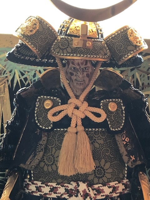BOSSさんの兜飾り 本日兜飾りを片付ける際に、1/6のフィギュアに着せられるか試してみたのですが、サイズが全然違っておりました・・・(笑) 兜の方が2倍くらいは大きいようです・・・う〜ん、残念。 くやしかったので、1/6の頭部だけ無理矢理挟み込んで撮影してみました。 「エルム街の悪夢」のフレディの頭です。 BOSSさん♪アンガト! マリンコング... もはや知る人ぞ知る国産怪獣TVドラマ。今となっては着ぐるみ造形はとても可愛らしくどぉみても「ゆるかわキャラ?」それを当時のスタッフは照明やらなんやら工夫の限りを尽く視聴者の子供たちを恐怖におとしいれたモンなんですよ。BOSSさんの特撮画像のように♬ 兜飾り 怖いよ~~~~っ!! お子さんがちっちゃいときコレやらんでよかったね、絶対トラウマモンですよね。コレ八つ墓村の武者木乃伊より絶対怖いって!! 努さんの改造D-REX ブッカさん お元気でしょうか。