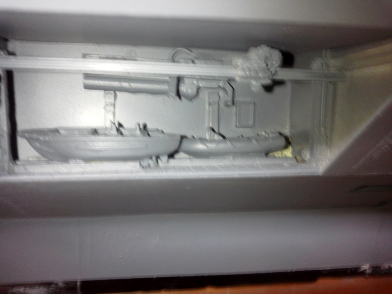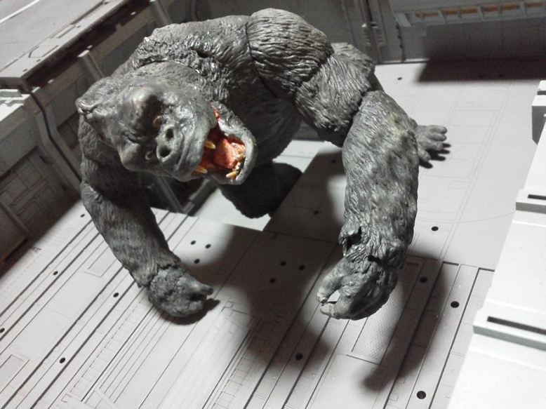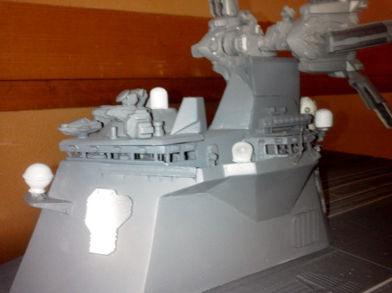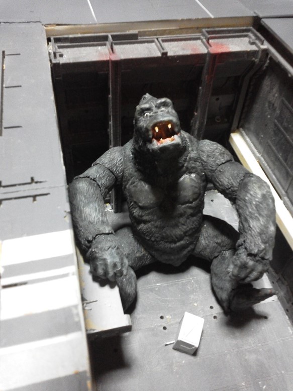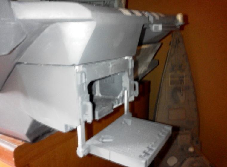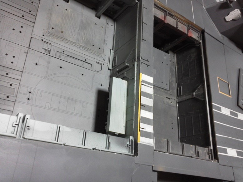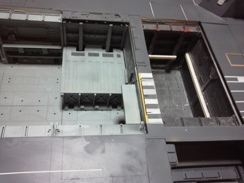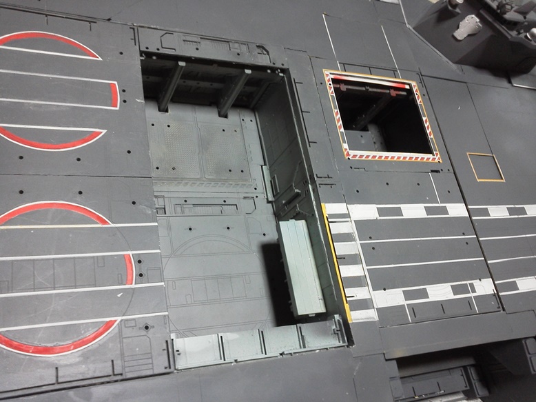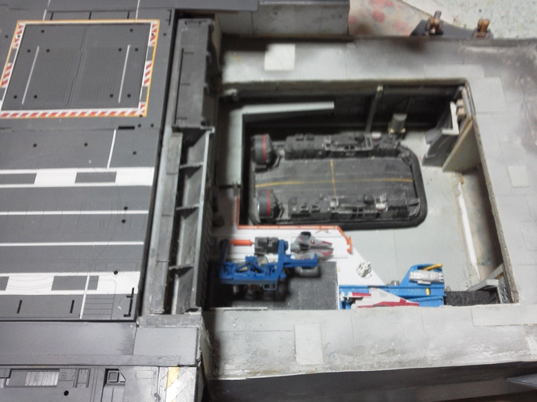 21:25画像追加 そこそこお片付けできたので、1/144多目的護衛艦「魁鷹」で少し遊んでみようかと・・・。 「早く、甲板に並べて遊びたいっ!!」それが人情。ところがギッチョンチョン。 そうは簡単には遊べないのが「魁鷹」っていうか・・・我が家の住宅環境の悲しいトコ。 汗、汗また汗・・・・。 タンスからおろして、床やら甲板の取り付けやらで早々に力尽きる。 常設じゃないと、とても並べて楽しむまで辿りつけそうもない。 左画像の左が車両用の第一格納庫の床部。右の小さい方は動力室一部になる予定の床。 右画像は航空機用の第二格納庫の床とエレベータ部をセッティングしたもの。右側は機動二足機用の第三格納庫と専用エレベータ。 その後、ようやく飛行甲板をセッティング。エレベータはフタ式。 そして艦尾LCACと特殊潜航艇用第四格納庫。(未仕上げ) 艦尾は甲板と側壁一体取り外し式。これだけでも持つと盾になる(笑) ここまで組むと毎回ほぼ力尽き、航空機を並べるどころでは無いのダ・・・ 今日は悔し紛れで片付ける前にゴリラ4を置いてみた。 第二格納庫のエレベータ部のみ取り外し、第一格納庫に座らせた。 1/144サイズで考えるとゴリラ4の身長はおよそ28m程度・・・小さい。 あまり居心地が宜しくないのか、不機嫌顔で第2格納庫まで上がってきたゴリラ4(笑) はぁ・・・・日本の家は小さすぎる。 「魁鷹」に航空機を並べてカッチョよく写メするだけでも1ルームが必要・・・ 艦体も重量が増してきたので、秘密基地に搬入するのも容易ではなさそう・・・どぉしよう(苦笑) 本日お掃除