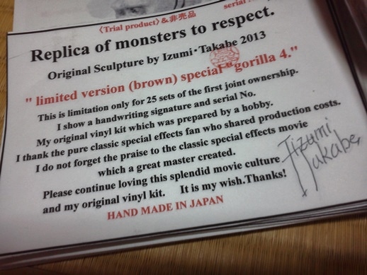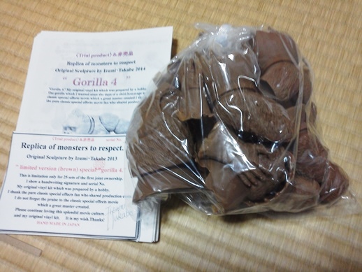 3日13:40追記 USAに向けEMS発送、本日完了予定 ブログの皆さんの発送事故対応用予備数セット残し在庫無し!終了。 みんなアンガト!!今、苦手な発送作業完了して帰宅。 これでも昨日より1時間以上早い。「はこBOON」の伝票は車内で自分で貼った。 お店のレジや店員さんにご迷惑はかけられません。 自宅車3分のコンビニ。暗くなると見えないので昨日は車を置いて帰宅。 昼間は少し見えるので近距離ならば運転可能(笑) 今日は発送第2陣。すでに、続々と無事到着の知らせが元気の素。 あんなにあった「ゴリラ4」や「いぐあな」は終了。 発送事故・不備対応用を残すのみ。残りは全てUSA5月のワンフェス用に発送される予定。 国内?知らない。 追加もコメント無さそうなのでキリよく終了。イベントに参加も考えていない。 さて、画像の気になる茶色の成形品について。 いまだ赤字。このままでは次の新規製造はできない(涙) あとは、FBで耕した海外友人が頼み。 その海外友人用「USA限定茶色ゴリラ4」(50セット発注したうちの30セット) 特別手書き署名カードとシリアルナンバーが付く。 国内では、特別な友人にN041~50までが配布される。 あとは、5日までに海外EMS発送完了させれば、T-REX製作に集中できる♪ さあ、みんな「ゴリラ4」や「いぐあな」で楽しんで!! これは、みんなが、自分たちで楽しむ為に製造費分担して生みだしたオリジナルビニルキット。 すでに、利益を生まない理由でメーカーも真似できない私達だけの製造品! 楽しむ権利は私達誰もが所有するコトができる権利!法的にも合法なんです!! 今年は「ゴリラ4の春」 Let's enjoy a hobby together!! ボンさんおめでとう♪ haseさんカスタムパーツ&1985ゴリラ一式は リストNo⑥ボンさんが当選。 【ボンさんより】 今、ゴリラ君届きました〜〓︎ 喜び勇んで開けると、な、なんとhaseさんのカスタムパーツが当たってるじゃありませんか〜〓︎ 親びん、haseさん、そして抽選場の方達(笑)本当にありがとうございます! もう自分の中では春真っ盛りですよ〜、同封のゴリラ君も、黒成型色は持っていたので茶ゴリラ君は最高の贈り物です! 中略 興奮の余り、支離滅裂な文になってたらすみませんm(_ _)m 本当にありがとうございました! ボンさん、組み立ては、落ち着いてからですよ~ん。怪我しないでね(笑) まだ、懐かしの1985ゴリラ完成品〈竹〉&〈松〉説明書がどなたかの箱に!? 3日17:10追記 では、何かと発送がバタバタしとりますので、もうお一方の当選者発表です。 リストNo㉞ mad munstersさん!! 1985ゴリラ〈竹〉&〈松〉の説明書。 そんなのいらねぇ~~~~っ!の場合は是非ヤフオクに♪ イタズラ気分でみんなで楽しみましょう。 以前みたいに¥5000でも入札なければゴメンちゃい(笑) ゴリラの春を待つ方々掲示板