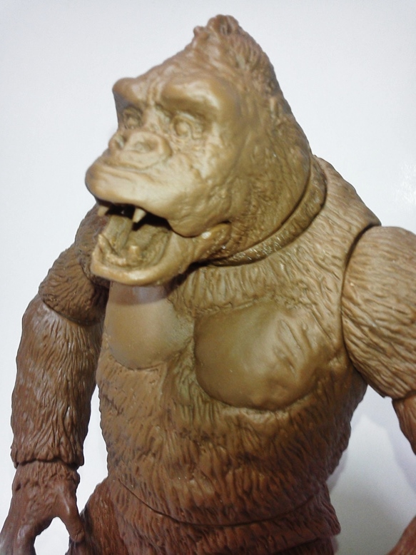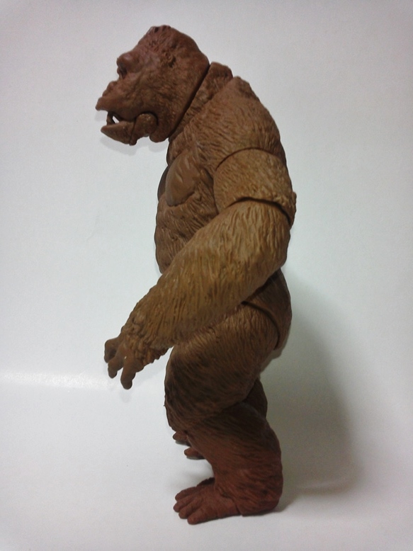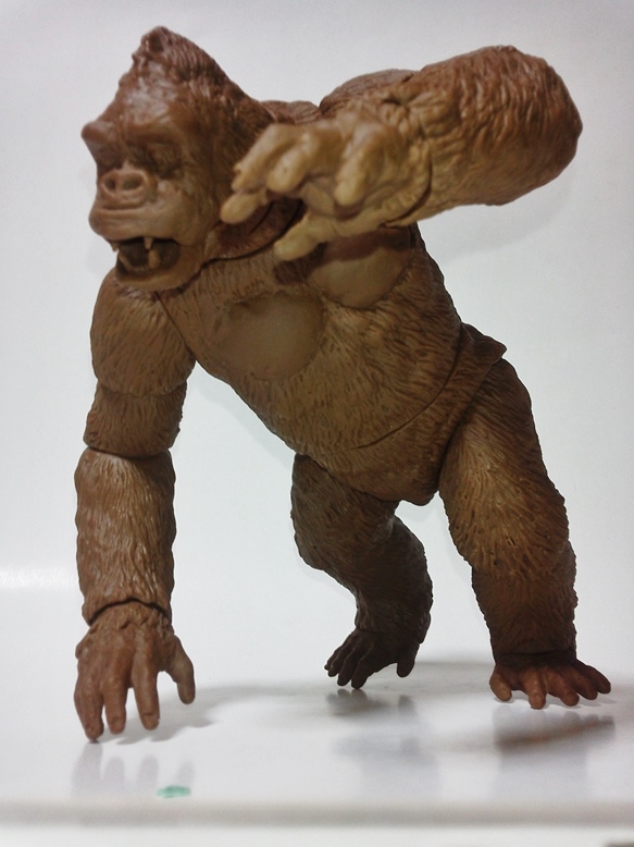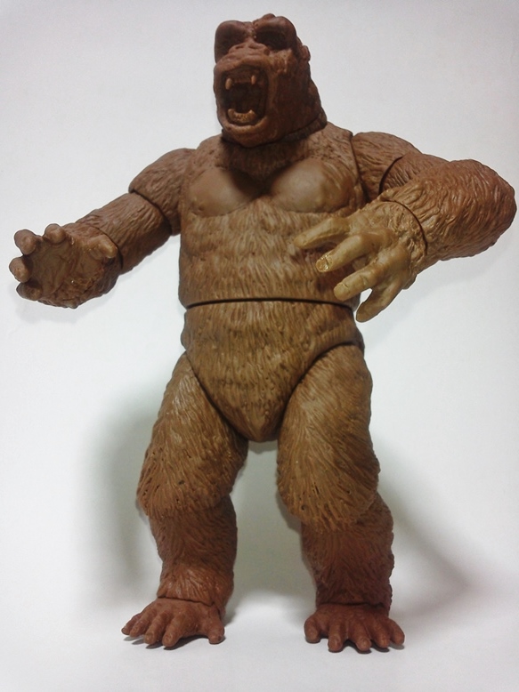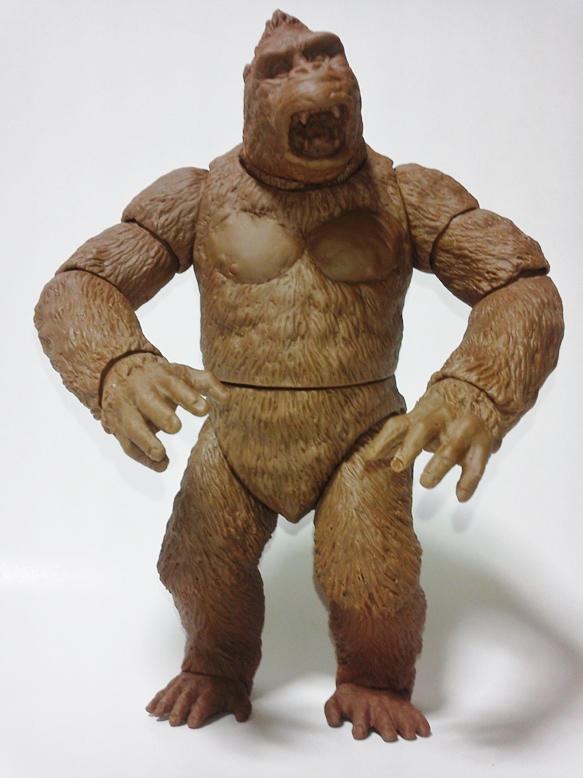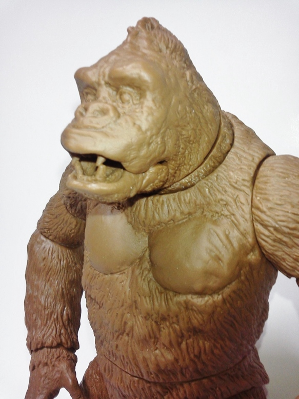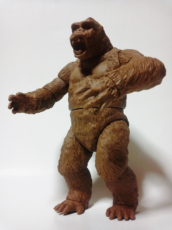 本日茶色成形2セット。共有用ゴジラブルー1セット届いた。 早速素組みして具合のチャック。金型屋さんより左手中指に「抜け」なる症状について指摘有り。 金型が温まれば収まるとのこと。 その他の検証については、少しずつ追記とし、とにもかくにも、画像を楽しんでみてください。 「ゴリラ4」もともと、やりたかったのは「夢の対決遊び♪」大きさは20cmサイズ。丁度良い。 30cmサイズしか興味無い方は、どこかのメーカーが30cmサイズで販売してくれるのを待てばよいだけ♪ 今後、べらぼうな©契約し、べらぼうなコストかけて販売してくれるメーカーあれば良いですね。 価格は間違いなく¥10000であればお買い得。エクスプラスの¥20000前後の価格が商売であれば適正な価格と云えます。 まずは、下あご可動(たいしてうごかねぇ・・・でも口閉じ顔改造簡単♪) 4点接地はこれ以上腕を長くできず・・・指先接地で対応。 あとは、取り換え用の頭3種とポーズで遊んでみた。・・・金型5枚なら、握り手楽勝で追加できたか・・・無念っ! 「丸い顔」VSプテラノドンポスター風に「怒り」強調。 「長い顔」VsT-REXや丸木橋を落としたタイプ。口可動タイプは「長い顔」です。 【オマケ】 T-REX着手