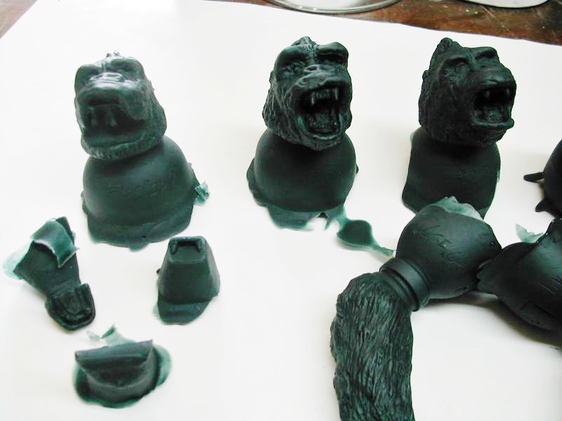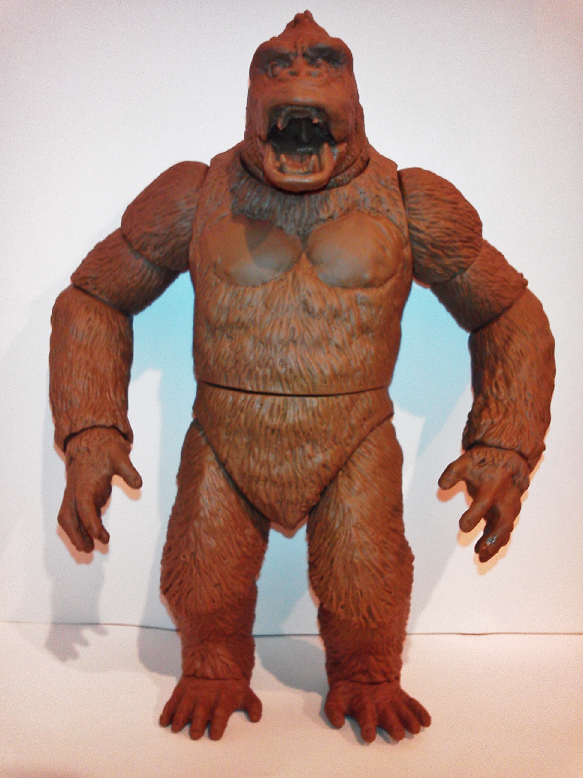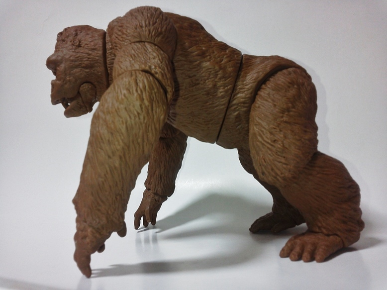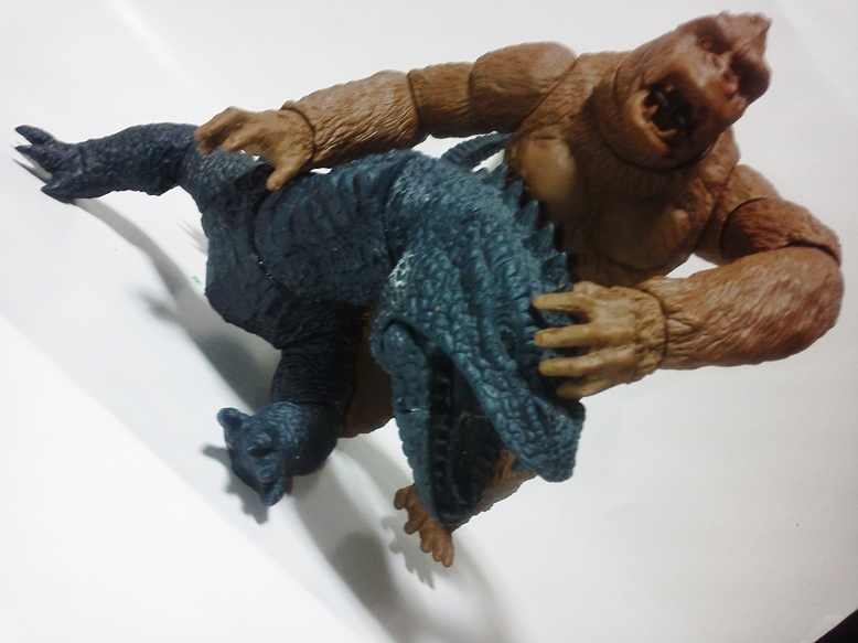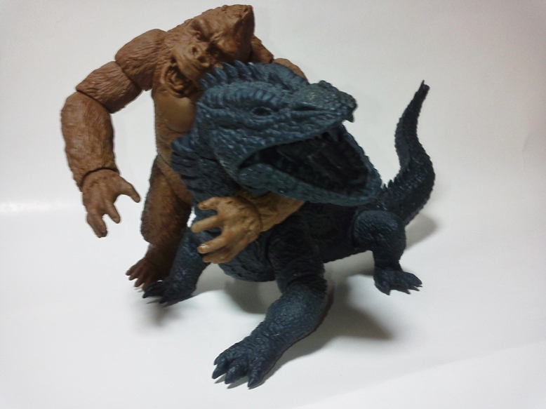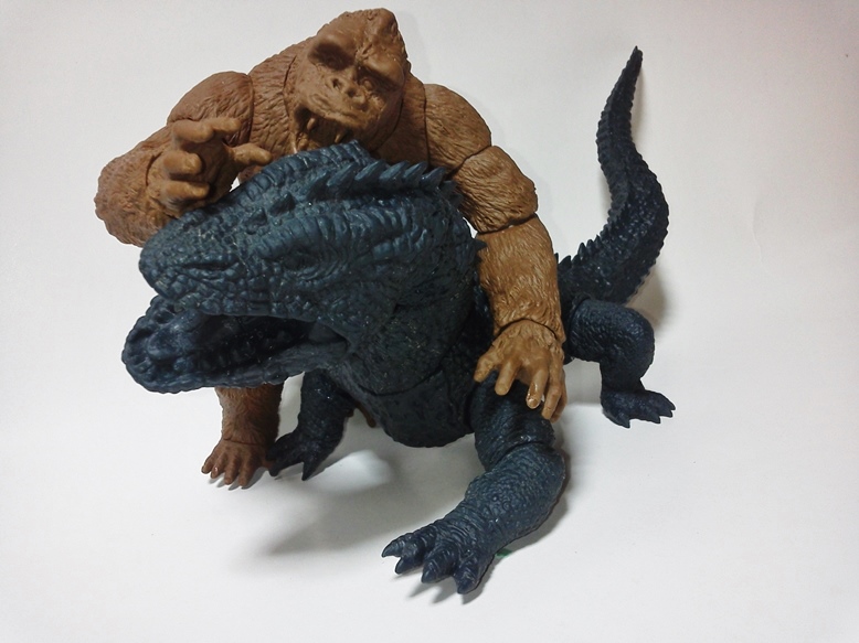 本日茶色成形2セット。共有用ゴジラブルー1セット届いた。 早速素組みして具合のチャック。金型屋さんより左手中指に「抜け」なる症状について指摘有り。 金型が温まれば収まるとのこと。 その他の検証については、少しずつ追記とし、とにもかくにも、画像を楽しんでみてください。 「ゴリラ4」もともと、やりたかったのは「夢の対決遊び♪」大きさは20cmサイズ。丁度良い。 30cmサイズしか興味無い方は、どこかのメーカーが30cmサイズで販売してくれるのを待てばよいだけ♪ 今後、べらぼうな©契約し、べらぼうなコストかけて販売してくれるメーカーあれば良いですね。 価格は間違いなく¥10000であればお買い得。エクスプラスの¥20000前後の価格が商売であれば適正な価格と云えます。 まずは、下あご可動(たいしてうごかねぇ・・・でも口閉じ顔改造簡単♪) 4点接地はこれ以上腕を長くできず・・・指先接地で対応。 あとは、取り換え用の頭3種とポーズで遊んでみた。・・・金型5枚なら、握り手楽勝で追加できたか・・・無念っ! 「丸い顔」VSプテラノドンポスター風に「怒り」強調。 「長い顔」VsT-REXや丸木橋を落としたタイプ。口可動タイプは「長い顔」です。 【オマケ】 T-REX着手