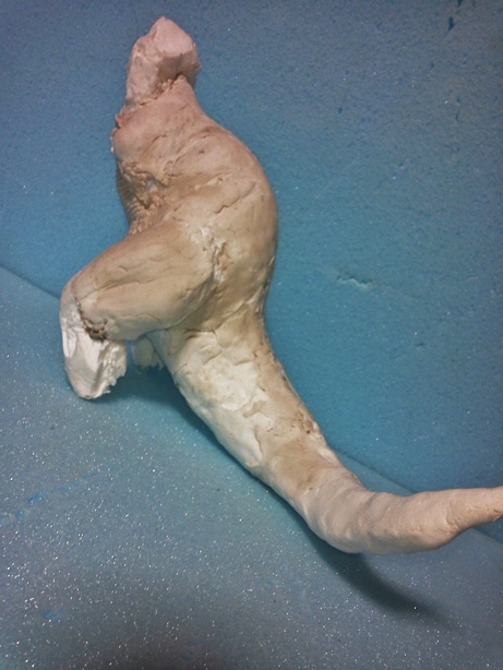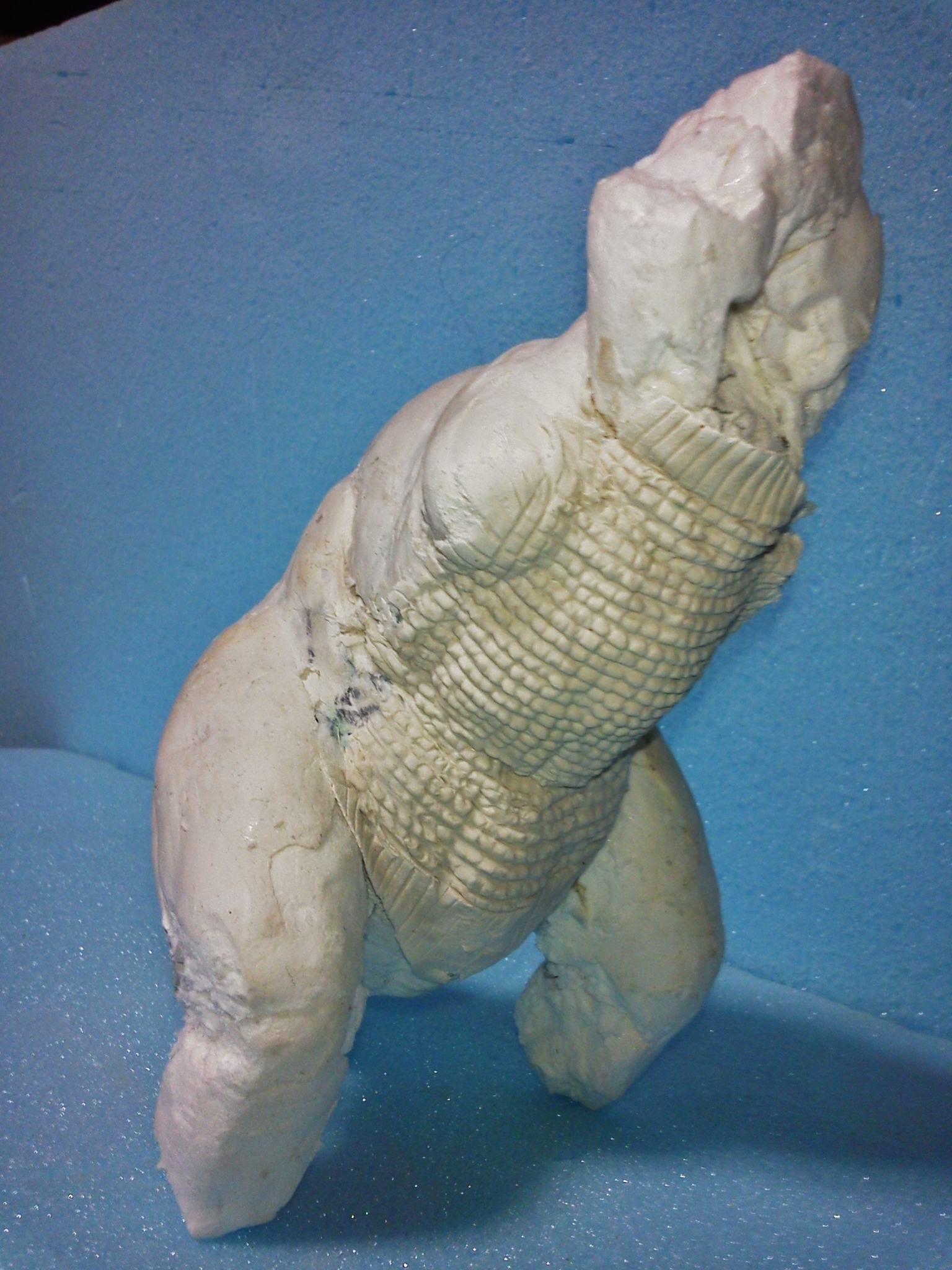 テストショット本日発送しますの連絡有。 悶々の日々、先日届いた紙粘土で「T-REX」を作りはじめた。 まだ、おおまかな大きさを割り出し、形状を確認している段階。 まるで幼稚園の頃の「油粘土遊び」実に気楽です。同時に頭の中に資料画像を摺込む。 ひゃははっ、まるで「サツマイモ」。 でもいつも、こんなモンです。 この体表ははじめて。眺めているうちについついいじくってみた。 胸と腹の表現試作。意外と手間がかかる。 普通、仕事として請け負うならスタンピングとかやるのだろうけど・・・オリジナルはおそらくヘラによるちまちま手作業。同様に私もちまちま手作業でやってみた。 やはり、その効果はあるようだ。スタンピングとか、モールド貼り付けとは明らかに違う存在感?気のせいかなぁ・・・・♪ 「金星ドラゴン」は腿の形状と足付け根部、腰回りを徹底改修。腕は手首で2mmほど詰めた。 本日、お知らせ頂いた「ゴリラ4」成形費見積もりが予想以上に高額。 およそ「いぐあな」の倍。 金型費用とあわせると・・・ペイは考えない事にした(笑) ただ、誤解無きように。これは私が考えても妥当な見積もり。 仕事に見合う報酬として当然な額であることをご理解頂きたい。 「ゴリラ4」テストショット画像届く。