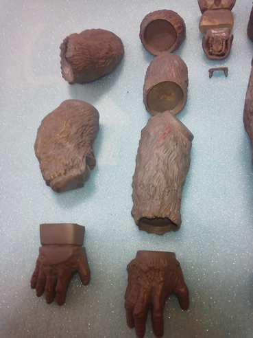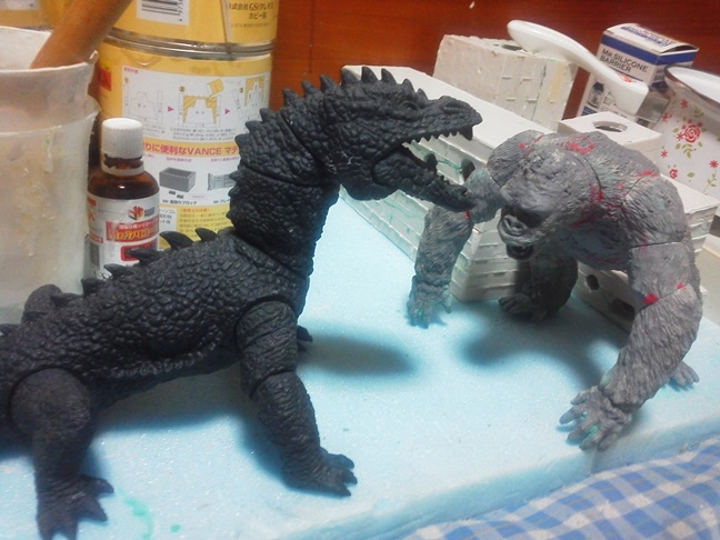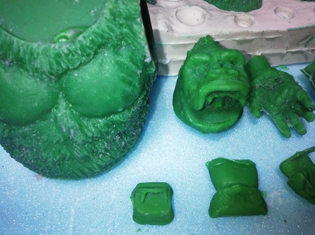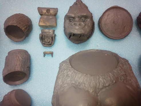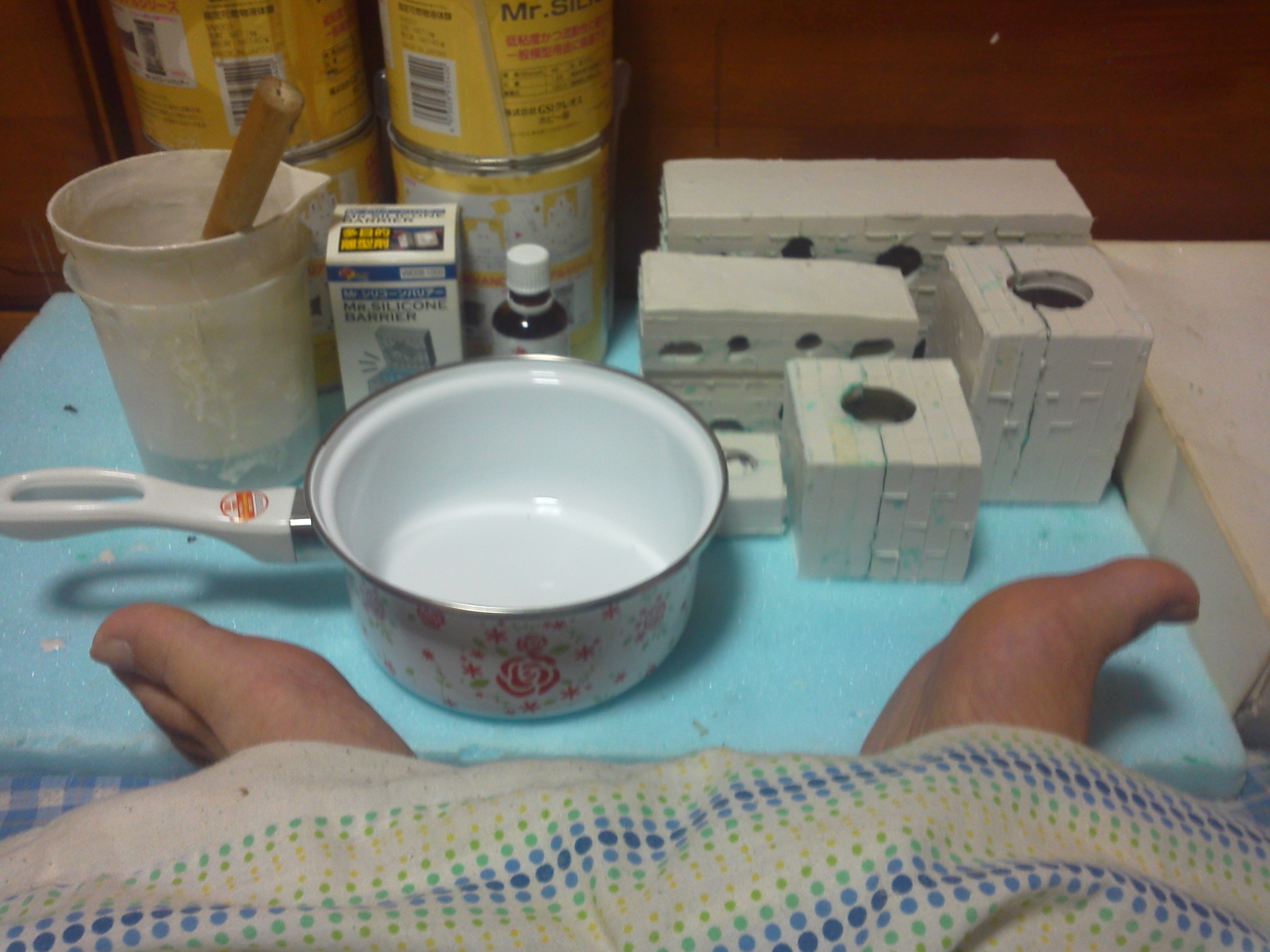 まずは、とりあえず塊を鍋に溶かす程度の準備♪ついでに試しに・・・えっ???すいすいす~い・・・全部のシリコン型に流し込めた・・・所要時間約30分・・・嘘・・・まさか、こんなんでできてる訳無いよなぁ・・・とりあえず、玄関に放置。いぐあなとゴリラ君が見ててくれるでしょう。後方の白いのはMJY現在乾燥中♪