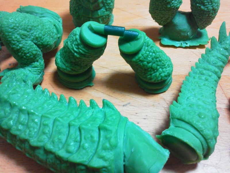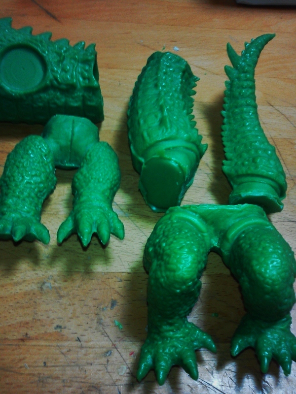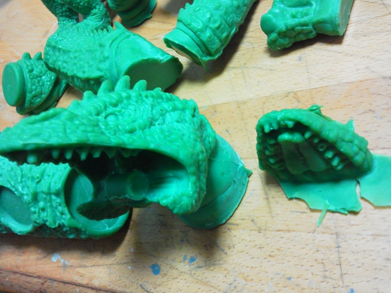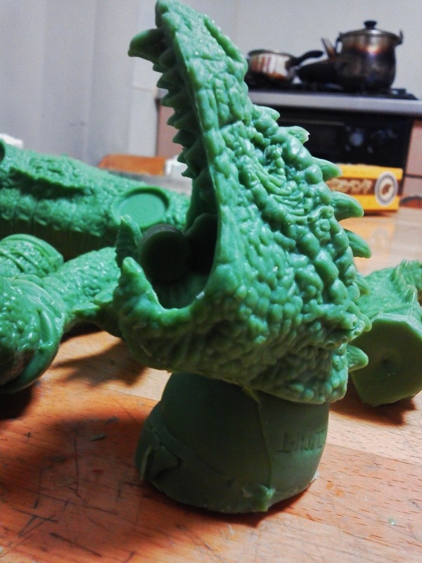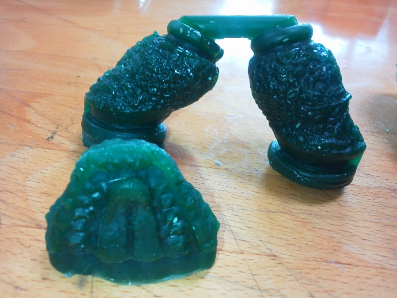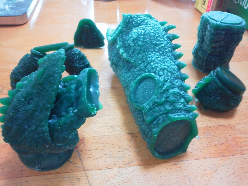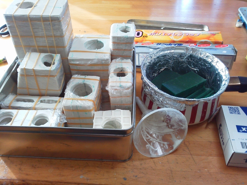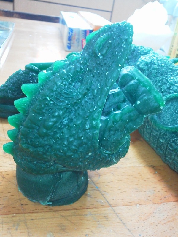 インジェクションワックスを初体験♪ 全てダメ元♪自分の手を汚してみなければわからないコトがある。 うまくいってしまっていれば「お笑い」だが、明日の研修で具体的な?がいっぱい♪ 本日届いた「インジェクションワックス」を小鍋に入れて「湯煎」 けど、小コンロで溶かした。 とにかく使用適正温度(多分、融点±10度??)をカン頼みでの荒業。 あとは片手にシリコン型、片手に小鍋で流し込む。 一応、最初は少しだけ注ぎ型を回して湯がキバやトゲなどに入るよう願ったが所詮「荒業」期待は全然していない(笑) 意外とすんなりおわる。 現在、冷ましております。 結果は如何に!?お昼寝後追記予定。 17:40追記「できてる?」 意外とパーティングラインも簡単に修整できそうです♪ やはり流し込みだけでは、キバに湯は回らなかった(笑) 胴体は惜しい!肩付け根部に小さな気泡。 このレベルなら、最悪シリコン型持ち込めば金型屋さんならスンナリとワックス元型製作できちゃうのでは??? レジン流すより、準備・片付け・仕上げ含めればかなり楽かもです? 明日は予定通り東京縦断です♪ 5日12:05追記 19:30追記の追記 15:30早くも追記(笑) 週刊月曜日は「B級怪物を楽しむ会」第8回 「いぐあな」ワックス流し込み(汗) 準備 ①「いぐあな」のシリコン型 ②ポリラップ ③アルミホイル敷いたナベ ④ワックス その他 灯油ストーブ=アルコールランプ こんな感じで作業がはじまる。 ・・・ナベは結局ガスコンロに(笑)途中ナベをゆっくり回す。ときおり「ぷくぷく」と気泡がでる。温度計高かったので購入せず。まずは駄目モトでやってみる。 融点かどぉか知らないが、ナベから煙みえたら、とりあえず高温注意でコンロからナベを離す。 この間、ストーブ前でシリコン温めておく。ポリラップでしっかり型を巻き、ワゴムを補助程度に使用。 ※ポリラップは意外と熱に弱い・・・少し溶けた(汗) 結局、ナベから直接デカい湯口にそのまんまゆっくりと流しこんだ。まずはやっってみないと何もわからない。 購入した1オンスで流し込めたのはおよそ半分のパーツ型。勿論追加購入予定。 試しに一番デカい「体」シリコン型にも流し込んでみた。あと少しのトコで足りなくなりゲームオーバー。 こりゃ、どうせやり直しだろうと、大胆にあとからかき集めたナベ底の残りワックスを流し足す。(笑) とにかく、適切な温度。気泡対策が当面の課題。現在ゆっくりと温かい部屋で固まるのを待つ。 結果は如何に(笑)19時ころ画像とともに追加記事予定。駄目そうなら、シリコン型までで納品。あとは金型職人さんにまかせてしまおう♪ 玄さんの「ザリガニ」画像 アボガドからモールドを取り、マジスカ貼り付けスタンピング方式。 えっ!黒い「マジスカ」もあるの? 混ぜ込んで手がべとついた?? そんなコトもできるんだぁ! このコの目もイイなぁ♪ それにしても、脚といいヒゲといい・・・なかなかの根気仕事しとりますです。 ・・・まだまだ続きます♪ 「ゴリラ4号」アゴ改修画像 公開してなかった画像?残っておりましたのでUPしてみました。 結局、どんどん改修し最初に作ったのは芯材程度にしかならない(笑い) 多分「金星ドラゴン」も同様に改修を繰り返し、最後は全くの別モノになっちゃったりするのです。 15:30早くも追記(笑) 記事更新してる間に冷めてるようなので取り出してみた。 ひゃははっ。コリャ駄目だぁね。 でも、アゴと腕付け根パーツはまぁできてる。コレは最初に流し込んだ型だ。 途中でワックスを追加してナベにぶち込んだのは・・・白っぽくなっている=細かい気泡だらけだし、湯が入りきっていない。 さて検証&リトライ。 半分面倒になってきている(笑) 最後に流し込んだデカい体パーツなんぞ「珊瑚」のような感じで笑えます。 ただ、口開閉ギミック差し込んで試すコトできました。 これだけはなかなか良い感じで「パカパカ」 振り回しても外れない♪ 疲れたので、追加注文のワックス届いたらリトライ。 それまでは口「パカパカ」やって遊んでます。 パカパカ・・・ぱかっ・・・馬鹿っ! 19:30追記の追記 ロストワックス ROMA インジェクション用ワックス。1kgROMANOFF社の流れが良く、腰もある高品質なインジェクションワックス。使用温度 68~75℃金属加工、彫金用。本日注文。やはりワックスにはシリコン型流し込み(インジェクションワックス)専用なるものがあった。 今日使用したワックスの色と金型屋さんで見たワックスの色が違う!これが今日やってみて確信。こちらの方が近いようだ。 金型屋さんにアポ。東京縦断は木曜日。シリコン型のみ持参で発注かワックス原型も持参で発注か? 何にしても、技術の獲得を優先したい。今日注文したワックスでできてもできなくても研修はしてきますです。 あとは・・・ちゃんと家にたどり着くことは最優先。場合によっては無理せず一泊するかもです。 あ・・・・今週中関東以北M5は超える地震ある・・・電車止まらなければ無問題。 ソフビの成形等について