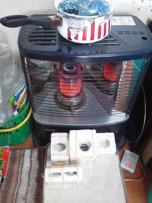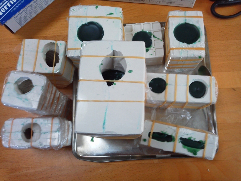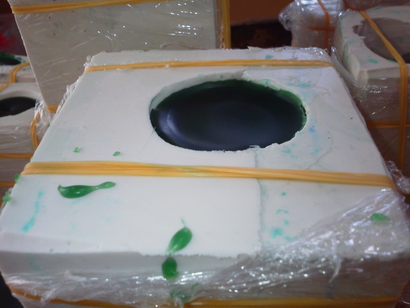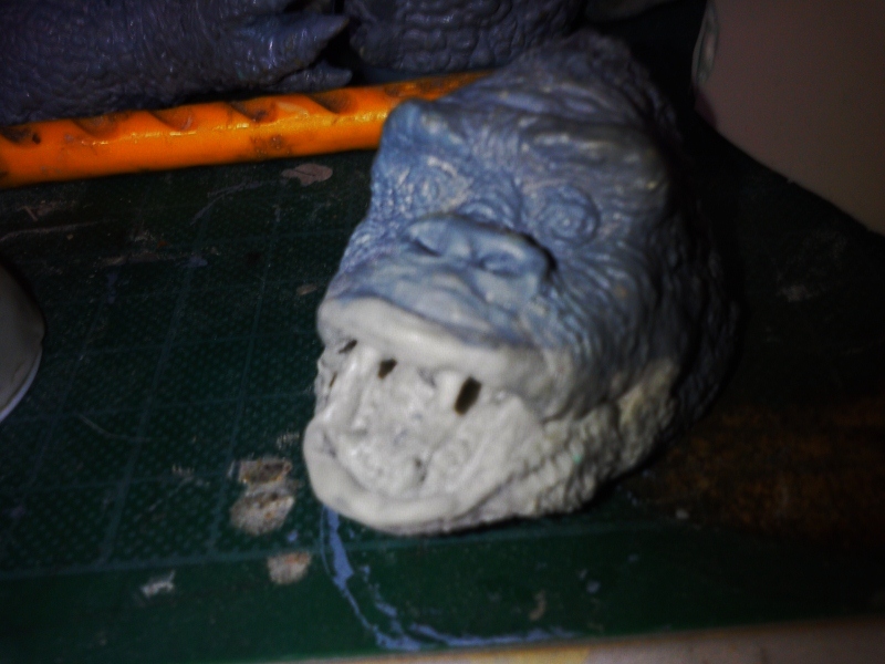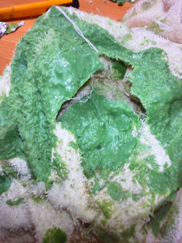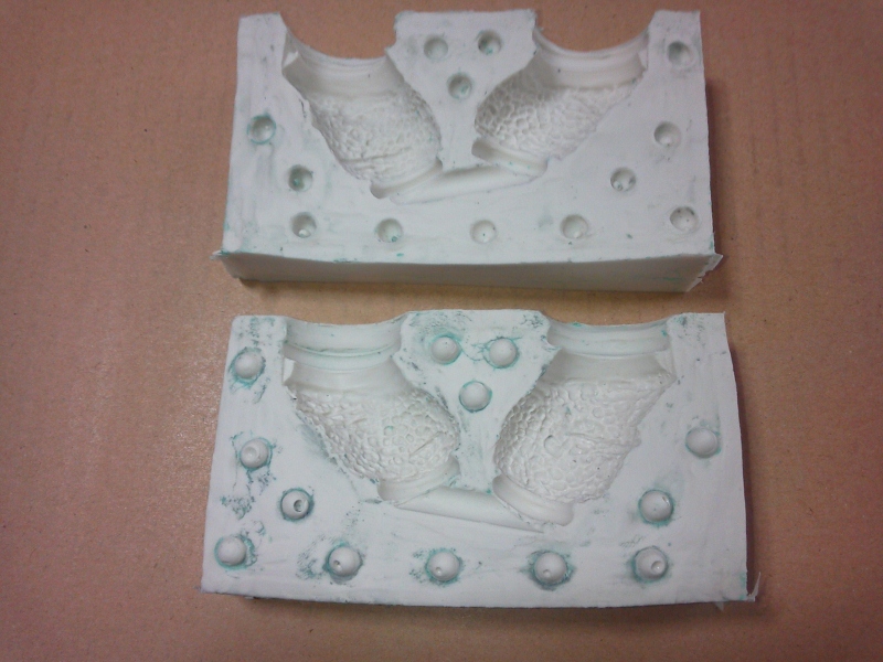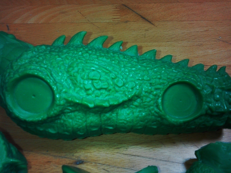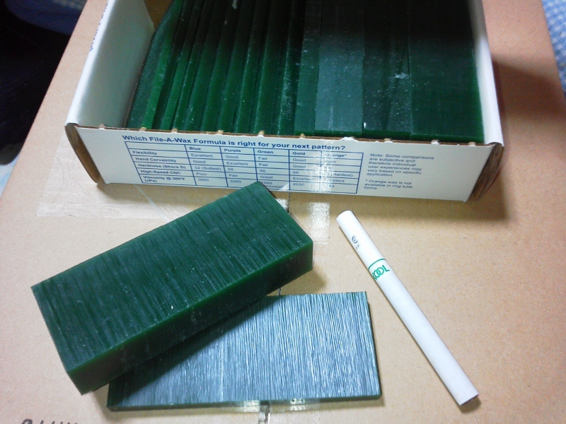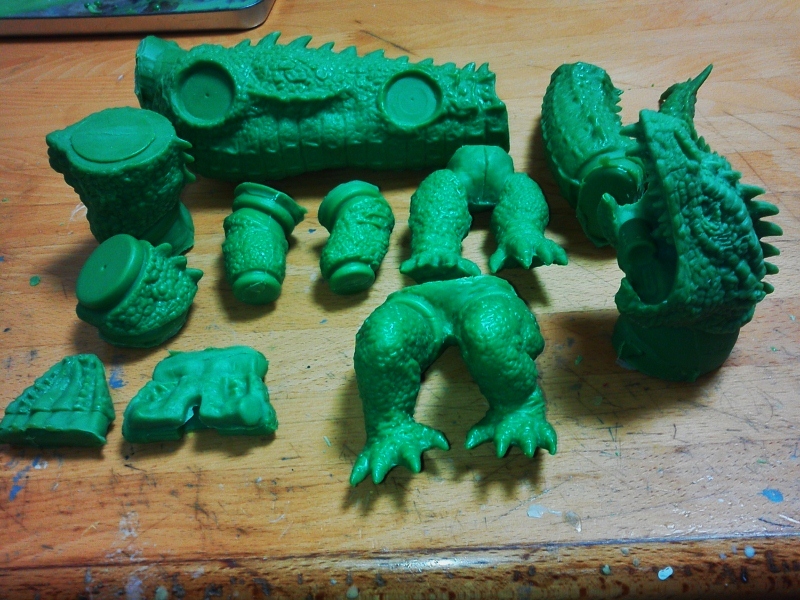 インジェクションワックスを初体験♪ 全てダメ元♪自分の手を汚してみなければわからないコトがある。 うまくいってしまっていれば「お笑い」だが、明日の研修で具体的な?がいっぱい♪ 本日届いた「インジェクションワックス」を小鍋に入れて「湯煎」 けど、小コンロで溶かした。 とにかく使用適正温度(多分、融点±10度??)をカン頼みでの荒業。 あとは片手にシリコン型、片手に小鍋で流し込む。 一応、最初は少しだけ注ぎ型を回して湯がキバやトゲなどに入るよう願ったが所詮「荒業」期待は全然していない(笑) 意外とすんなりおわる。 現在、冷ましております。 結果は如何に!?お昼寝後追記予定。 17:40追記「できてる?」 意外とパーティングラインも簡単に修整できそうです♪ やはり流し込みだけでは、キバに湯は回らなかった(笑) 胴体は惜しい!肩付け根部に小さな気泡。 このレベルなら、最悪シリコン型持ち込めば金型屋さんならスンナリとワックス元型製作できちゃうのでは??? レジン流すより、準備・片付け・仕上げ含めればかなり楽かもです? 明日は予定通り東京縦断です♪ 5日12:05追記 19:30追記の追記 15:30早くも追記(笑) 週刊月曜日は「B級怪物を楽しむ会」第8回 「いぐあな」ワックス流し込み(汗) 準備 ①「いぐあな」のシリコン型 ②ポリラップ ③アルミホイル敷いたナベ ④ワックス その他 灯油ストーブ=アルコールランプ こんな感じで作業がはじまる。 ・・・ナベは結局ガスコンロに(笑)途中ナベをゆっくり回す。ときおり「ぷくぷく」と気泡がでる。温度計高かったので購入せず。まずは駄目モトでやってみる。 融点かどぉか知らないが、ナベから煙みえたら、とりあえず高温注意でコンロからナベを離す。 この間、ストーブ前でシリコン温めておく。ポリラップでしっかり型を巻き、ワゴムを補助程度に使用。 ※ポリラップは意外と熱に弱い・・・少し溶けた(汗) 結局、ナベから直接デカい湯口にそのまんまゆっくりと流しこんだ。まずはやっってみないと何もわからない。 購入した1オンスで流し込めたのはおよそ半分のパーツ型。勿論追加購入予定。 試しに一番デカい「体」シリコン型にも流し込んでみた。あと少しのトコで足りなくなりゲームオーバー。 こりゃ、どうせやり直しだろうと、大胆にあとからかき集めたナベ底の残りワックスを流し足す。(笑) とにかく、適切な温度。気泡対策が当面の課題。現在ゆっくりと温かい部屋で固まるのを待つ。 結果は如何に(笑)19時ころ画像とともに追加記事予定。駄目そうなら、シリコン型までで納品。あとは金型職人さんにまかせてしまおう♪ 玄さんの「ザリガニ」画像 アボガドからモールドを取り、マジスカ貼り付けスタンピング方式。 えっ!黒い「マジスカ」もあるの? 混ぜ込んで手がべとついた?? そんなコトもできるんだぁ! このコの目もイイなぁ♪ それにしても、脚といいヒゲといい・・・なかなかの根気仕事しとりますです。 ・・・まだまだ続きます♪ 「ゴリラ4号」アゴ改修画像 公開してなかった画像?残っておりましたのでUPしてみました。 結局、どんどん改修し最初に作ったのは芯材程度にしかならない(笑い) 多分「金星ドラゴン」も同様に改修を繰り返し、最後は全くの別モノになっちゃったりするのです。 15:30早くも追記(笑) 記事更新してる間に冷めてるようなので取り出してみた。 ひゃははっ。コリャ駄目だぁね。 でも、アゴと腕付け根パーツはまぁできてる。コレは最初に流し込んだ型だ。 途中でワックスを追加してナベにぶち込んだのは・・・白っぽくなっている=細かい気泡だらけだし、湯が入りきっていない。 さて検証&リトライ。 半分面倒になってきている(笑) 最後に流し込んだデカい体パーツなんぞ「珊瑚」のような感じで笑えます。 ただ、口開閉ギミック差し込んで試すコトできました。 これだけはなかなか良い感じで「パカパカ」 振り回しても外れない♪ 疲れたので、追加注文のワックス届いたらリトライ。 それまでは口「パカパカ」やって遊んでます。 パカパカ・・・ぱかっ・・・馬鹿っ! 19:30追記の追記 ロストワックス ROMA インジェクション用ワックス。1kgROMANOFF社の流れが良く、腰もある高品質なインジェクションワックス。使用温度 68~75℃金属加工、彫金用。本日注文。やはりワックスにはシリコン型流し込み(インジェクションワックス)専用なるものがあった。 今日使用したワックスの色と金型屋さんで見たワックスの色が違う!これが今日やってみて確信。こちらの方が近いようだ。 金型屋さんにアポ。東京縦断は木曜日。シリコン型のみ持参で発注かワックス原型も持参で発注か? 何にしても、技術の獲得を優先したい。今日注文したワックスでできてもできなくても研修はしてきますです。 あとは・・・ちゃんと家にたどり着くことは最優先。場合によっては無理せず一泊するかもです。 あ・・・・今週中関東以北M5は超える地震ある・・・電車止まらなければ無問題。 ソフビの成形等について