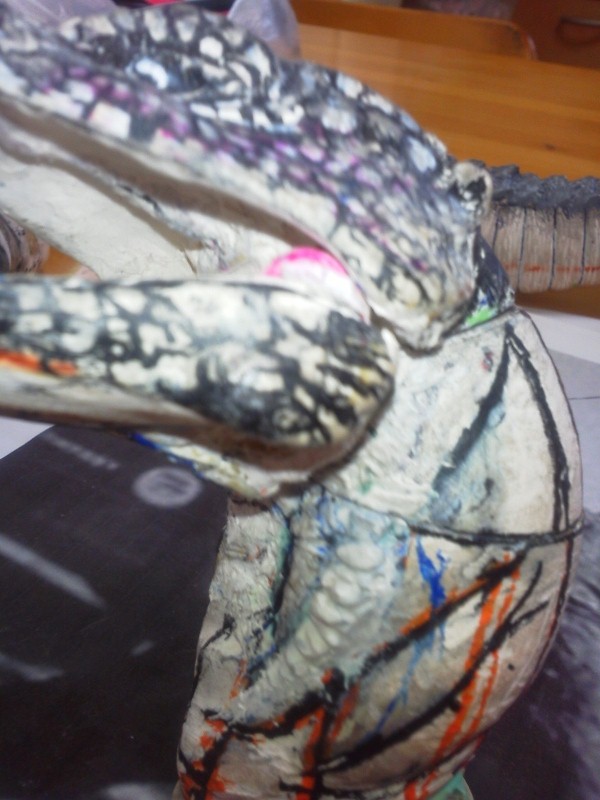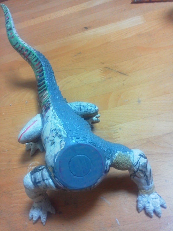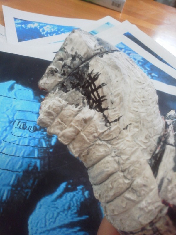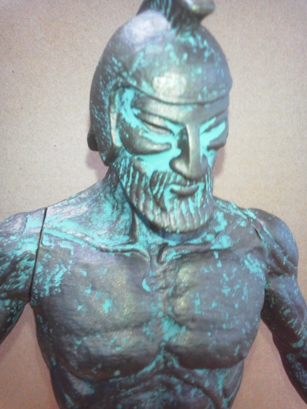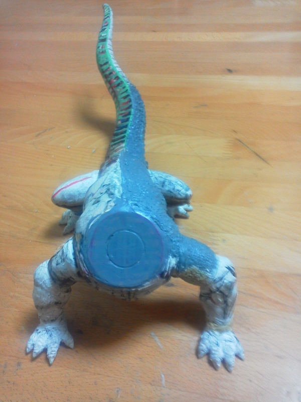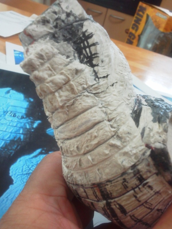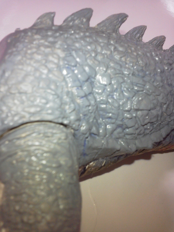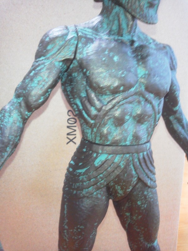 かなり以前にアマゾンで予約。画像みて一目惚れ。ライン損なわない可動玩具にちょっと期待。 かなりお高いお値段なので迷ったが、酒井氏の原型でもあり、 画像がカッチョ良かったので「ぽちっ♪」 届いた箱のデカさ、さらにお金かけたパッケージ(いくらぐらいについてるんだろう・・・) に驚くが、中身は意外と小さい? すぐ開ける(笑) 首まげて♪・・あ・・途中から首外れた・・すぐ差し込む♪ 口開けた♪・・・あ・・・顎外れた・・・すぐ直す。尻尾は大丈夫♪翼の付け根なんか・・・直そうとしたけど壊しちゃいそうなのでお片付け・・・ あちこち保護するためのブリスターがまるで知恵の輪(汗) 私が遊ぶにはちと手がかかるギドラ君。 ・・・きっと、ほとんどはパッケージ未開封?またはガラスケースに展示? 我が家じゃ、すぐ埃が積もって、掃除の度に(汗)・・・ それにしても、このパーツ数、組立作業だけでも大変そう。 頑張っている製品なんですけど。ガッツンっ!ガッツンっ!しては遊べません。 (そういう玩具製品じゃないですからぁっ!=遊べないアクションフィギュア) 今日の「いぐあな」 RKOさんへ♪ 首のつじつまが繋がりましたよ♪ オリジナルはラテックス(・・・だと思う) 首や頭の可動によっては、のどにかなりのたるみができる。(内側に入り込んで外側に膨らむ) トレースする場合の製作方法は意外と簡単♪ 「ファンド」のペッタンコの薄皮にあらかじめ蛇腹のスジと縦方向の突起だけつけてやり、 そのままオリジナル同様にたるませて貼りつけてやれば良い♪ 人形を作る際の服のシワと同じ技法。 この画像では新規製作した白い部分の下5段を普通に貼り付けたあと、 残り4段分をたるませて貼り付けた。 コレ、そうでもしないと簡単にトレースなんて無理っ! 細部に気がいくは、段の数間違えるは・・多分私にはできない(笑) この後、蛇腹に繋がるゴツゴツモールドのアタリを描き確認。 繋がりました♪鱗貼り終われば、ボリューム的にも全体の形状やバランス的にも 画像資料とほぼ一致する筈です。 あとは細部をどこまでトレースするかなんですが・・・ ついつい、やり過ぎてしまいそうでいけませんです。 (過ぎたるは及ばざるの如し、良い加減が大切なので~す) エクスプラス 青銅の巨人タロス