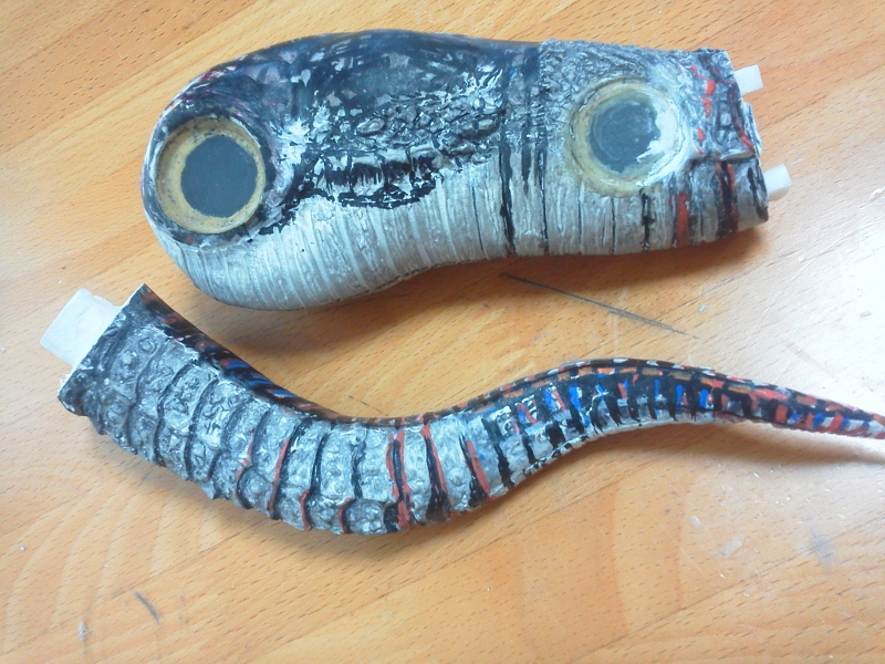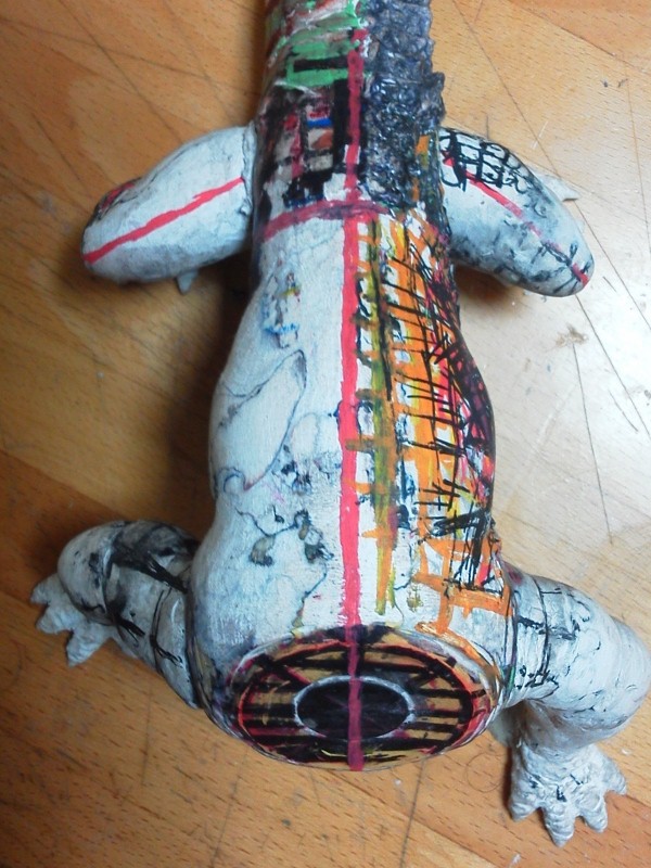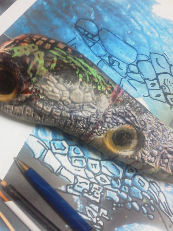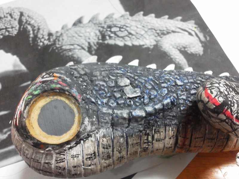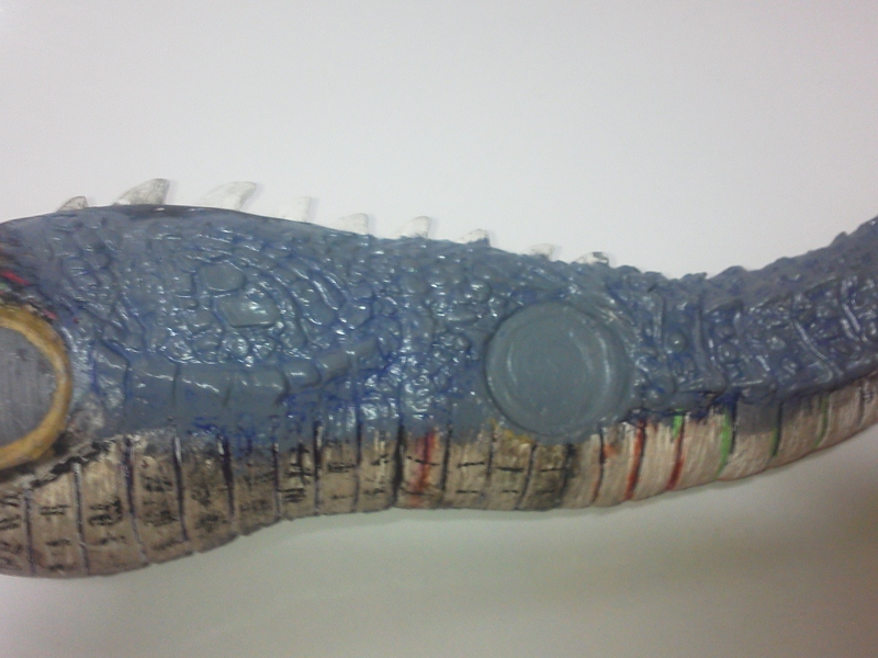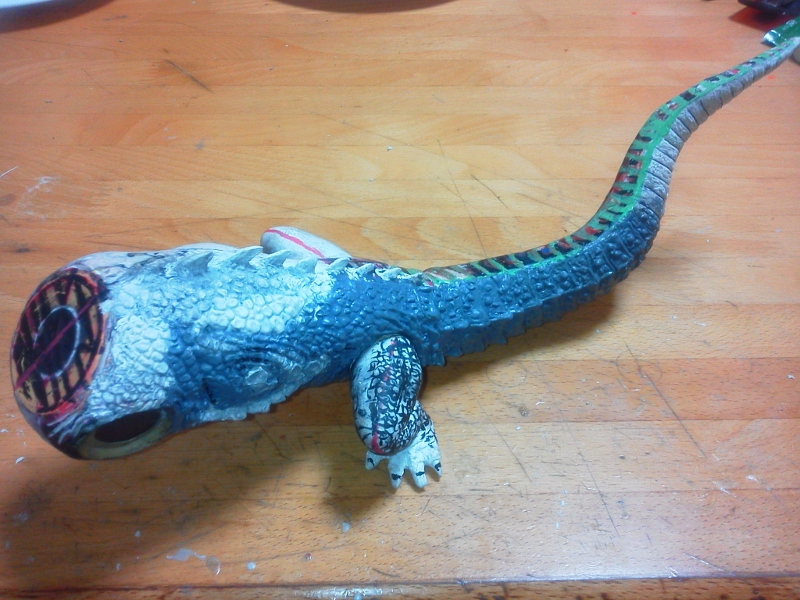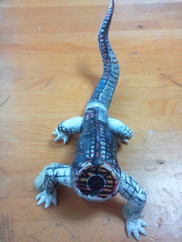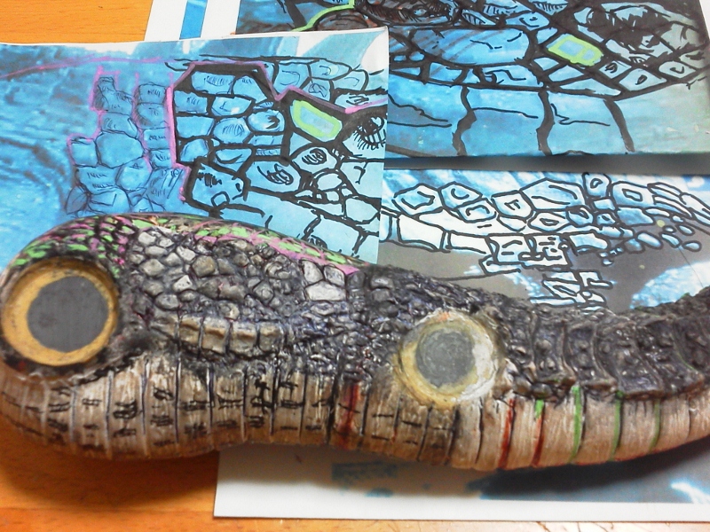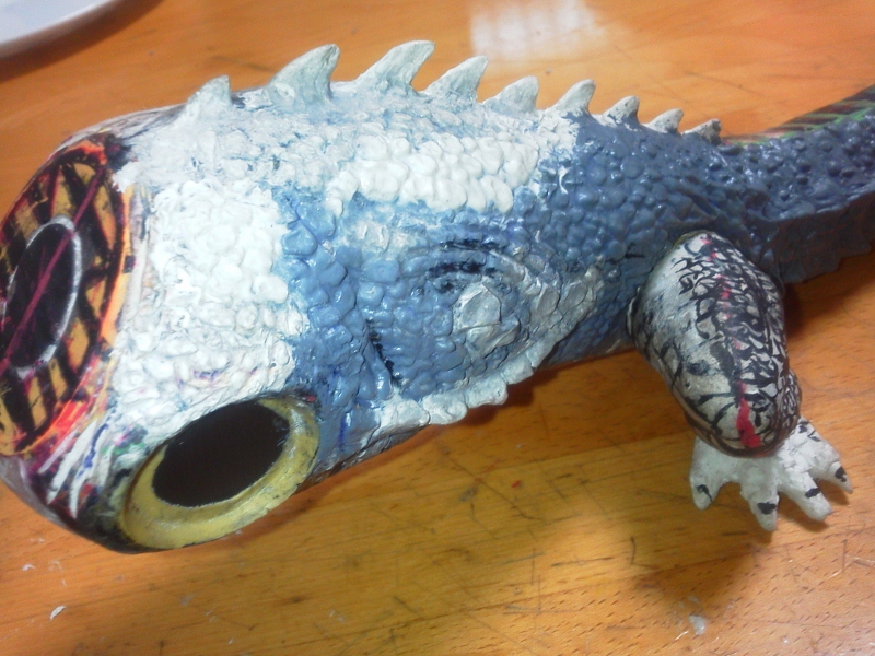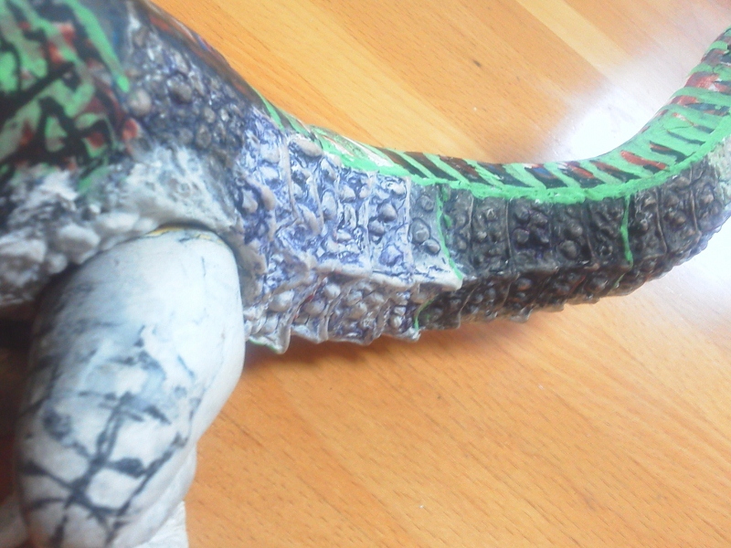 製作中の「いぐあな」、尻尾付け根体表に思いがけず難儀した。実に5度のリトライで