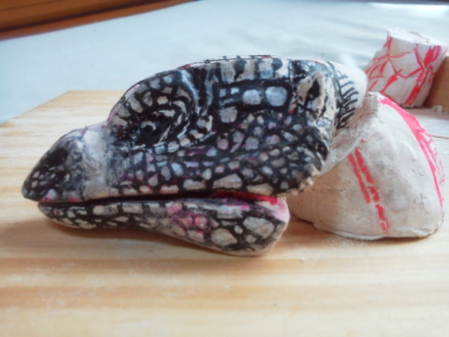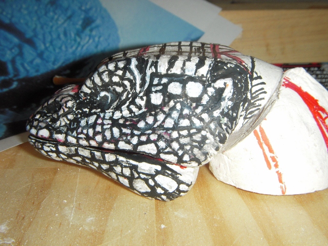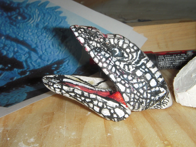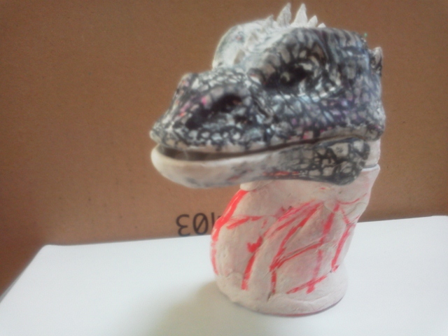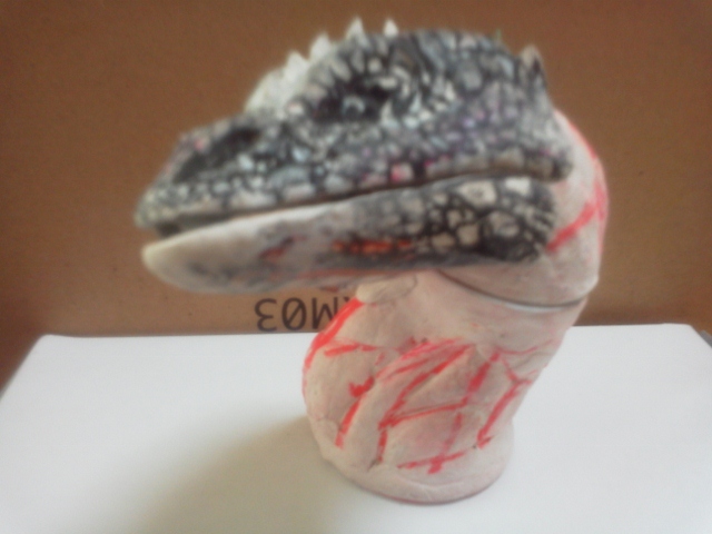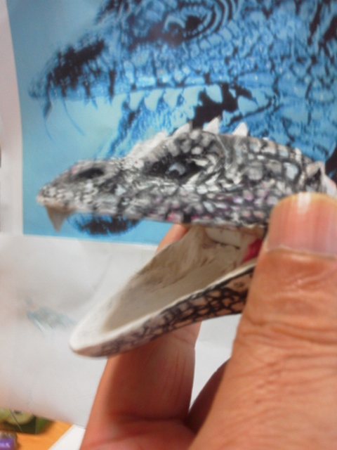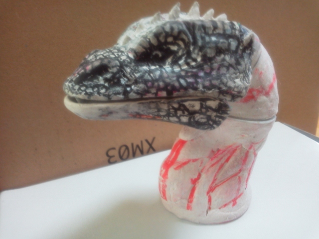 イグアナ3個目、およそ20年の歳月をかけて(笑) やっと口閉じ前牙収納状態ができました♪劇中のはもっと普通の牙。 こちらはおそらくプロップ撮影時にハウゼン氏がちょっとお色直し♪ かなり毒蛇を意識した牙。(すでに抜きを考えて湯逃げも加えています) ピンボケ画像・・・ 目が見えてないのと、持つと指先震えるまさにヨイヨイ状態。 ・・・でも多分こんなモンでとりあえず形を確定し先に進みたいと思う。 「好・楽・円」してなければ、ヨイヨイしながら、 ネットに「晩節を汚していて」なんてカキコされてまで、何の徳にもならない 「怪獣」の造形製作なんかしてないだろうなぁ。 きっと、今油彩画描いたら。「光の画家」とも呼ばれ、印象派を代表するフランスの画家、 クロード・モネと同じような風景が見えるかも知れない♪ ・・・・見えるだけでしょうけど(笑) 16:30追記 可動試験 またまた気を取り直して、忘れていた「レジぱっちん」取り付けて可動試験。 仮組みが非常にらくちんである♪ 可動原理はmaxファクトリーソフビガイバーの「ダーゼルブ」(過去記事有り)と同じ。 首と顔の傾きの可動は口の開閉とともに重要な課題。 これでまっすぐ前向き自然体やビリケンでの固定首の傾き程度のポージングが 形状を損なう事無く可能となる。 「うなづき」や「のけぞり」もできるようにするには通常の間着だけでは無理。 また、球形にしての可動もできなくはないのだが、多分形状台無し(汗) 基本リスペクトレプリカである事を最優先にしたい。 ・・・あとは首下付け根の角度ですねぇ・・現状は鎌首もたげての角度です。 ・・・harleyさん♪紙粘土はやはりこの手のモノ作るなら良い材料ですよ♪ 今回は訳あって、あくまで頭(・・・付け根間着部の径が大きさ確定の基準)を 基準に製作してますが、全体の形状をおおまかにデッサンしていく方法が普通ですからね。 ガラ携・・・