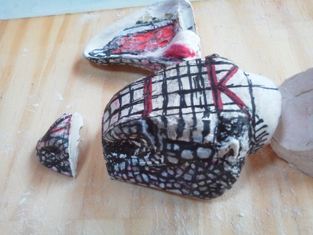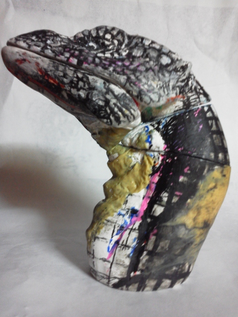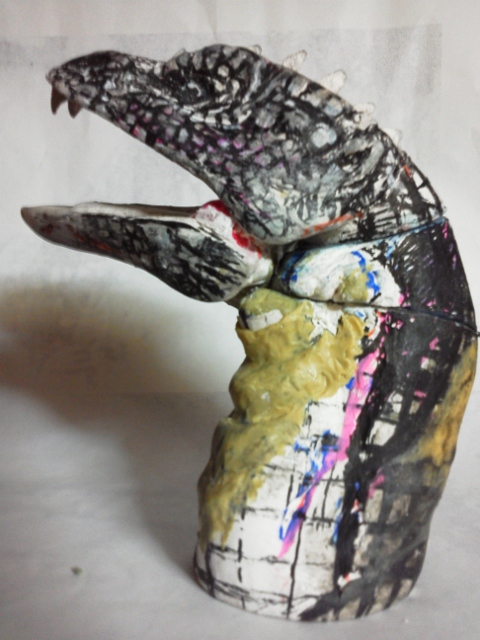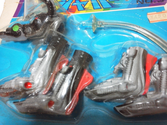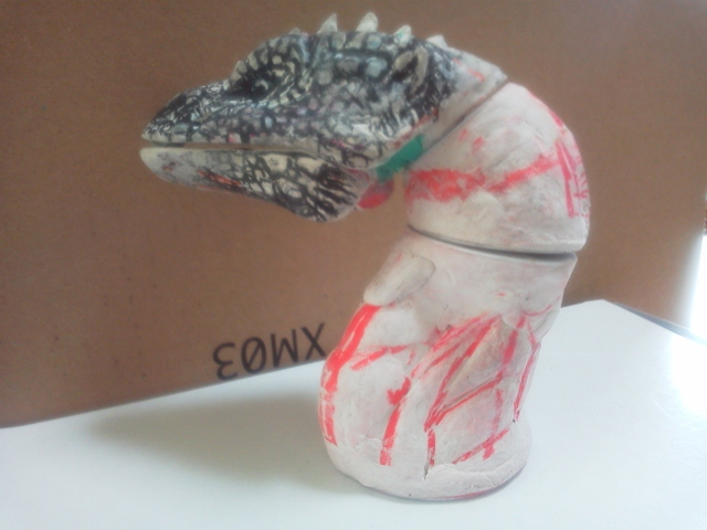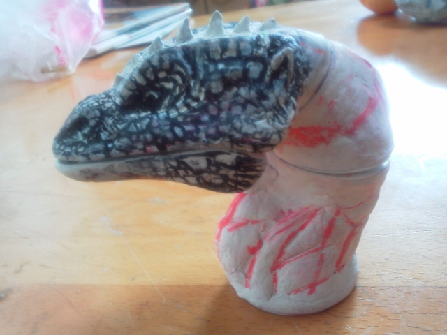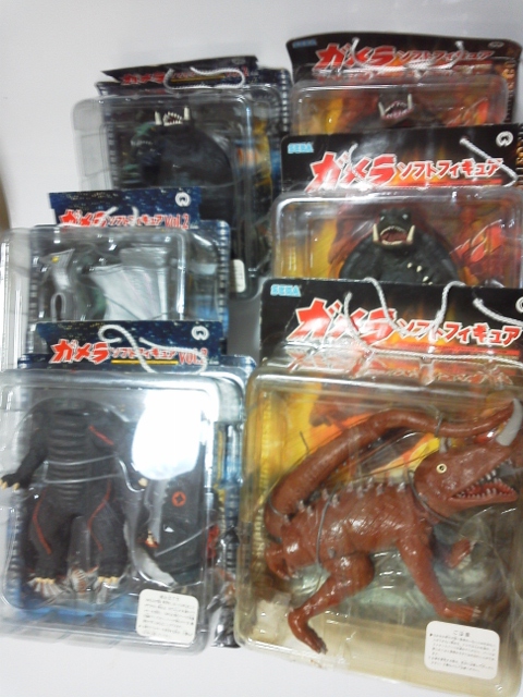 課題は可能な限りオリジナル形状の確保。 ジョイントやら差し込みといった機構に頼れば形状は例えコンピューターを使用して 設計しても限界がある。今回は昔ながらの間着可動のみ。 職人手作業ならではの仕事をするしかない。 そしてそれはデーター・情報としてコンピューターに入力は困難。 つまりは柔軟かつ試行錯誤&センスから導きだすしかない・・・ 現代においては実に効率が悪く、評価されることのない技術かもですね(笑) しかし・・・このレッドキングは無いだろう・・・ お前は卵にでも変形するのかってくらい形状ガタガタ。 メーカーなら、軟質併用などアーマチュア応用の製品だって可能でしょうに・・・ ことのほかラインの流れを大切にした造形にこだわっていた 成田先生が泣いておられるような気がするのは私だけでしょうか? まだとりあえずのパーツ接点の割り出しだけなので、首のデッサンをおこない、 形状確定時には隙間もそこそこには無くなるでしょう。 また体表に凸が張り付けられ、ボリュームが加わり、目論見通りいけば、まずまずかと・・・ 胸像じゃないけど、首だけ台座に固定し、顎と顔の接合をわざとゆるゆるにしてやると、 真ん中のパーツを回転させると、回転にともない顔傾げたり、口パクパク♪ 昔の伝承郷土玩具です。竹でできたヘビの玩具なんてみんな知らないんだろうなぁ・・・ 「温故知新」 と、紙粘土が尽きた・・・ 仕方ないのでせめて首のデッサン用ラインカキコミできるだけの仮肉付けをエポパテでおこなう。 すでにココで駄目だしっ!首下間着取り付け予定の首後ろもう少しカーブが必要。 それによって正面下部は前に4mmほどせり出す。 因みに実物のイグアナの首付け根は細くなっているし、 当然首を輪切りにしたら「円」などではない。 そのラインを形状損なうこと無く繋げていくのも職人技術・・・ って製作しながら試行錯誤し、やり直しながら最も良好な回答を見つけていく だけなんですけどね(爆笑)・・・・それにしても人に見せられる過程じゃないなぁ・・・ 汚いっ。経過の公開中止しちゃおうかしらん・・・考え中。 片付け優先のヤフオク出品 なにはともあれダンボール1箱分出品追加。 セガプライス、現在、エクスプラスモノで「商売」にできるのは大怪獣シリーズのみ(笑) こちらは在庫抱え過ぎて当時捨て値処分となったセガのプライズ「ガメラ」 すでに「商売」が終了したのか、現在まとめての出品はあまり無い。 入札者も「以前500円ででてたじゃん!」「1体200円なら入札してやってもいいか?」 と、完全に価格基準も荒らされて徹底下落した商品で全く期待無し。 多分出品すると笑われるかも知れない商品? 私も流石に最近は、ブリスターモノには興味なし。出して遊んでいないものだから愛着も薄い。 がさばるだけで邪魔者扱いされるだけの、とても可哀そうな玩楽多たち(涙) 開けて遊んでやれるものしか購入しないようにしよう・・・・自ら反省。 ブリスターつながり?なんでおんなじダンボールにこんなのが入ってたんだろ??? 覚えていない。 私の記憶では国内で見たはじめてのブリスター品? タカラ変身サイボーグのお供?ジャガー君用着せ替えセット。¥450 購入時の値札付き(爆笑) どぉ考えてもコイツを着せたら「長靴をはいた豹君♪」 さて、エフトイズのバルキリーが全く入札無し。 アクセスのべ300超え。わからん・・・この価格なら私が入札! なんて言っていたら、未開封1box1円出品?1320円を見つけて、迷わず入札♪ ・・・あれっ「ぽちっ」・・ナニっ「ぽちっ」・・・なんとっ「ぽちっ」・・・ コノヤロっ「ポチxチ」 気が付いたら自分で出品した時の価格じゃんかぁ~~~「・・・・入札撤退・・・」 まったく・・・ヤフオクから、いつのまにか馬鹿正直な? 出品者が消えちゃうなんてコトになっても・・・・関係ねぇや。 なんてやってると、ブログ炎上。 まぁ「イグアナ」が出来上がっても同様の可能性あったり・・・(苦笑) こんな隠居・道楽のオヤジ、オマケに滲出(しんしゅつ)性加齢黄斑変性症で ある事も判明致しましたので、全て笑ってお許しいただければ幸い。 完成できるのかなぁ・・・もしもの際には「イグアナ胸像」で我慢。 全体の形さえできていれば、あとは誰でも続きは作れだろうしケセラセラで~す♪ イグアナをファンドで④前牙とトサカ?