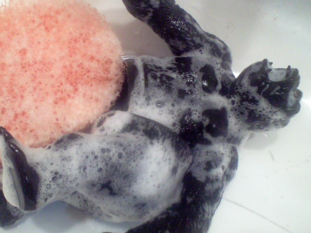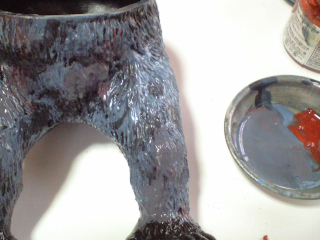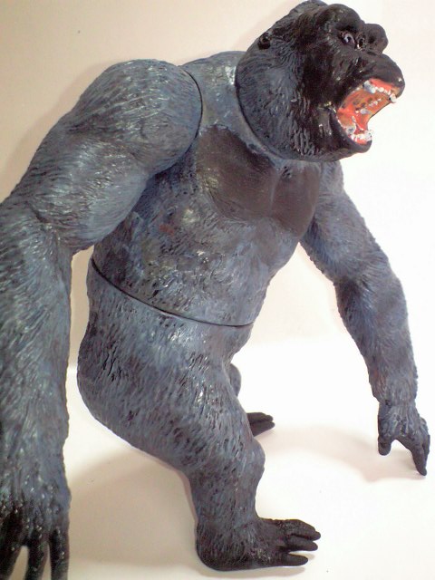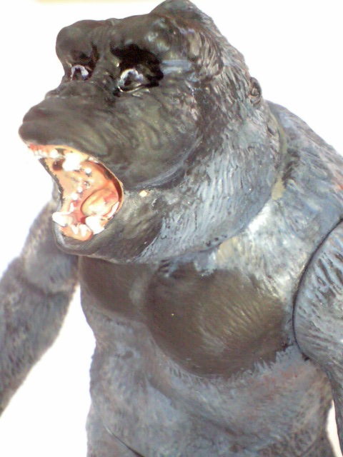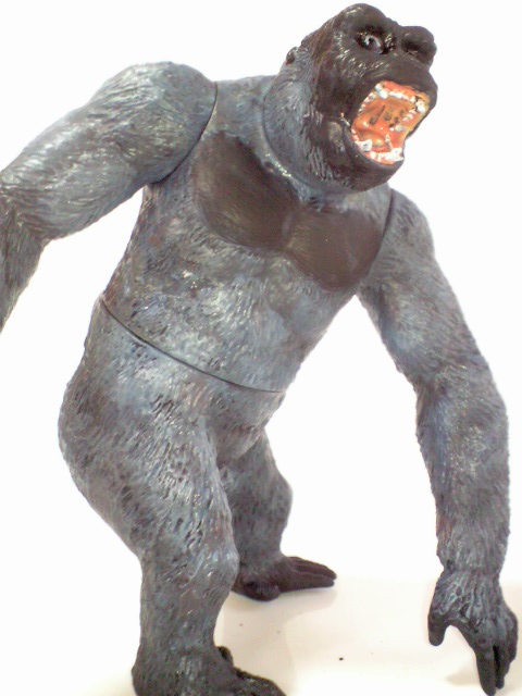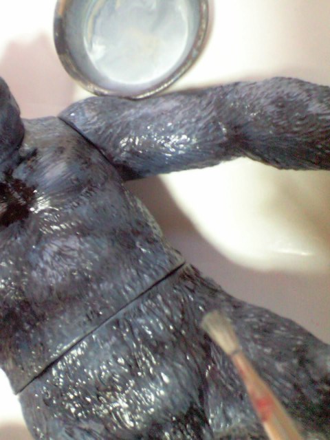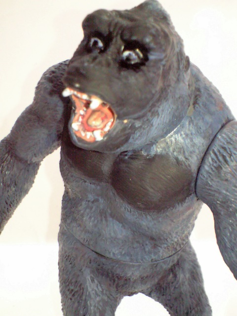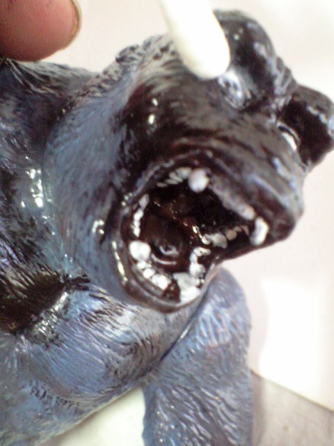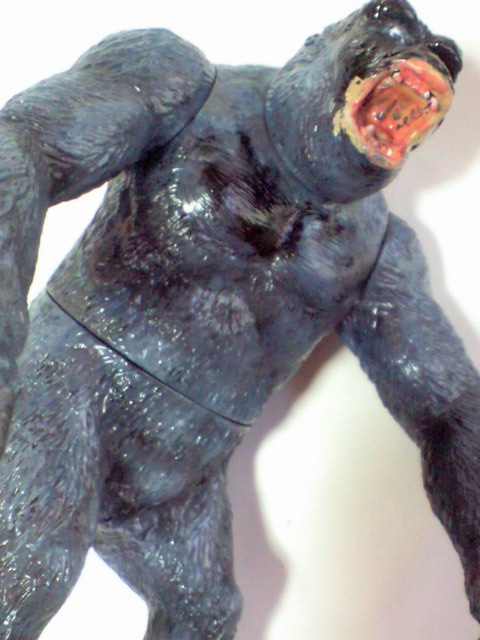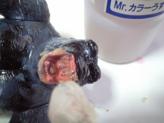 18日19:55 16日のコメント6の補足と修整をいたしました♪ 17日21:10内容一部修正 ブコ・・・手順示す番号は抜けてたり、画像の順番ちがってたりでスンマセン ちゃんと直しました(このテンプレ、いまだに編集苦労しとります・・・・) はじめての塗装♪楽しく「ゴリラ」 出演:ブッカ親びん(多羅尾伴大) ノンちゃん(お向かいさん家のチュウボー) ブ「よぉ、キングコングあげよっか、キングコング!」 ノ「なぁにそれ???・・・・ゴリラじゃん!」 ブ「そうとも云う♪なんだ知らんのか?特撮怪獣映画の原点なんだぞ!」 ノ「知らなぁ~い、それにまっくろじゃん・・・色ついてないしっ」 ブ「どぉせ暇そうじゃんかっ!プラカラー持ってくるから塗ってみな♪」 ノ「無理っ!めんどぃっ!!やったことないしっ!!!」 ブ「馬鹿者っ!自身の手を汚さず、文句言うだけじゃ、人間駄目なんだぞっ!!色なんか30分で塗れるよ♪」 ノ「無理っ無理っ!やりたくなぁ~い」 ブ「この「ゴリラ」、プレミア10万ついたのと同じやつなんだけどな~~いらねぇか♪」 ノ「ホントっ!やる!やるっ!くれるんだよねっ!絶対だよ!!!!」 てな訳で、全く興味の無いチューボーをたぶらかし、はじめての塗装♪楽しく「ゴリラ」と相成った(ブコ♪) 石鹸で洗い、キュッキュしたらOK♪プラカラーはラッカー系のMrカラー(ネイビーブルー、フレッシュ、ブラウン、ホワイト、ブラック) ガンダムマーカーのホワイト、ブラック。平筆が大小2本他。こんだけあれば、はじめての塗装なら十分♪ 1、まずは、ネイビーブルーを、平筆(大)で『ひょいひょい』下塗りだよん♪ ①筆先に付けるカラーの量(付け過ぎない方がイイよ) ②「塗る」というより筆先で気軽に色を『ひょいひょい』置くように ③ゴシゴシ塗りや,行ったりきたり塗りしないで一方通行で『ひょいひょい』♪ ④塗り残しあっても良いぞ(顔や胸、手足の毛なし部分塗らないでイイよ) ノ「だって、小学校ン時、ちゃんと塗りなさいって言われたモン!」 ブ「気にせず、毛並みにそって『ひょいひょい』行こう♪」 ノ「わぁっ!胸にはみ出したぁ~」 ブ「気にしない♪気にしない♪『ひょいひょい』気楽に楽しくね♪」 ノ「あんまり楽しくないし・・・・ホントに10万なの?」 ブ「はぁ~い、あと10秒で次いくよー♪」 ノ「無理ぃ~~~~~~」 って、できたじゃん♪(fastタッチからおよそ5分です) 2、色混ぜて重ねるよん♪(ネイビーブルー+黒=凹部 ネイビーブルー+白=凸部) ①皿の色混ぜきらない ②筆に付け過ぎない ③今度は『ひょいっ』と 軽くタッチするように ノ「エ~~っ!? こんなんでイイのぉ~??」 ブ「大丈夫、イイ感じ♪」 「そんな丁寧じゃなくて いいよん♪」 凹部の一番暗い色はブラウン+ブラック。 ブ「筆先で『ひょいっ』と 軽くタッチするようには同じだよん」 ノ「指についたぁ~っ クサぃしぃ~」 ブ「はぁ~い、あと20秒だよぉ~ん♪」 ノ「嘘ぉ~~~っ」 ブ「凹部付け忘れないか、見つけてごらん」 ノ「えっ・・・あ、あった!ここもだぁ」 ブ「やるじゃん♪プロでも見落とすようなトコだ」 ノ「ホントっ?ウチって才能あるじゃん♪」 ノ「・・・マジこんなんでイイの?なんかマダラだし・・・汚いし・・・」 ブ「みんなプロの完成品しか見ないモンね。下塗りなんて見ないモンね」 ノ「プロもこんな感じなのぉ?信じらんない!?おじさんもプロなの?」 ブ「私なんか、こんなモンかな?並べたらたいしてかわらん♪」 ノ「嘘ぉ~~~~・・・・・・・」 ブ「手品じゃないんだから、いきなり綺麗なのがポンとできちゃう訳ないよん(笑)みんなは途中の段階で、完成品のイメージと比較して、自分は下手だと思っちゃうんだろうね。あと数分後にはきっと驚くよ」 (ここまでにおよそ15分経過) 3.プロっぽくいきますか♪ ①皿の色混ぜきらない ②筆先に少しだけ付けて、 色が目立ちすぎない程度にワンタッチ。 ③今度は『ぴょっ』 と色を置くように ブ「運動会の組体操やったあとの体操服や膝小僧はどんな感じかな♪」 ノ「わかったぁ~!」 ブ「よくできました♪」 4.顔にいきまぁ~す♪ ブ「白目と歯!」 ノ「無理っ!絶対無理っ!!目なんて塗れないよぉ!!」 ブ「できたら、いよいよプロじゃん。はいマーカーです♪」 ノ「え・・・有り?なんですか??」 ブ「この筆で白目や歯をやれって方が無理でしょ♪さ、やってみよう!」 ①よくふる ②必ず紙などで試し描き ③先を強く押しすぎると「ぼたぁ~」とたれる ④フェルトの先でやさしくタッチするように ⑤うまくいかなきゃ、シンナーと綿棒でふきとりゃイイ♪ ノ「できたっ♪」 ブ「ぇっ・・・私より器用・・・・ブガ・・」 ノ「口の中は赤じゃないんだ??」 ブ「はみ出してイイよ、あとでふき取れるから」 ノ「赤まぜたいっ!」 ブ「持ってくるね♪」 少しずつ混ぜる・・・・混色もイイ感じだなぁ。 ブ「赤っぽくしたいトコに色を置くようにね」 5.はみ出しの修正 先を細くしたティッシュや綿棒にシンナーをつけ少しずつ、顔、胸、手足のはみ出しをふき取る 6.色をつなげる ①最初のネイビー
