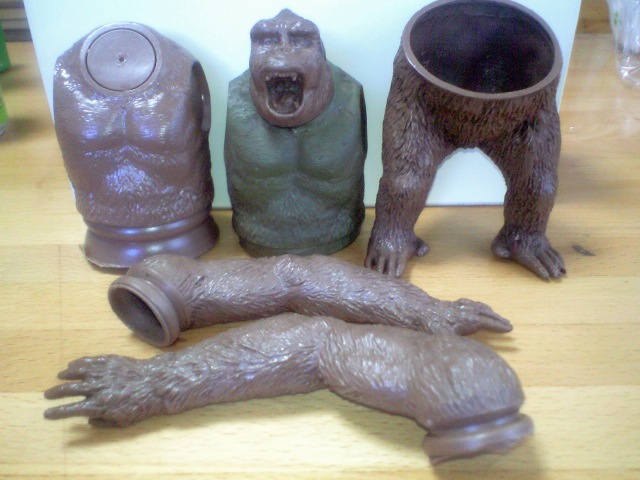 詳細についてはヤフオク説明で楽しみながらご理解頂けたかと(笑) これがコピー品やパクリモノではない証明とオリジナルソフビ「ゴリラ」未組立〈梅〉の補足をしときます。 これがスラッシュ金型 1986製作。近年多羅尾押入れ整理中に原型とともに発掘。 原型はヤフオクにて「ジャンボマシンダー大空魔竜」を落札された方にオマケでご提供させて頂きました(笑) そのうち「鑑定団」で北原氏に見て頂ければそこそこのお値段で買い取って頂けるかと♪ 今回この金型を製作して頂いた金屋さんにオーバーホールして頂き 少数個ですが、皆さんにご提供と相成った次第♪ こちらは1986ワンフェスにて一度だけ領布(当時¥2000) 超美少女高校生二人を日給¥10000で雇いいれ 午前中に予定数販売でボーナス昼食代¥5000 紙袋に女の子フィギュアいっぱいの行きかう方々に 「ゴリラ」を可愛らしく抱っこしてすりすりするように 呼び込み販売、このときのポーズと相手の顔との 接近距離とウル潤目線まで指示(爆笑) 1時過ぎにはブース片付け撤収・・・・今も昔もコレは変わりませんですね。多分・・・・ 茶色成形色が1986のもの。中央の緑の体はテストショット。ビリケンのリドサウルスに当時使用されていたPVC樹脂で成形されたモノ。 組み立てについての補足 〈復刻再掲〉昭和レトロに思わず涙・・・