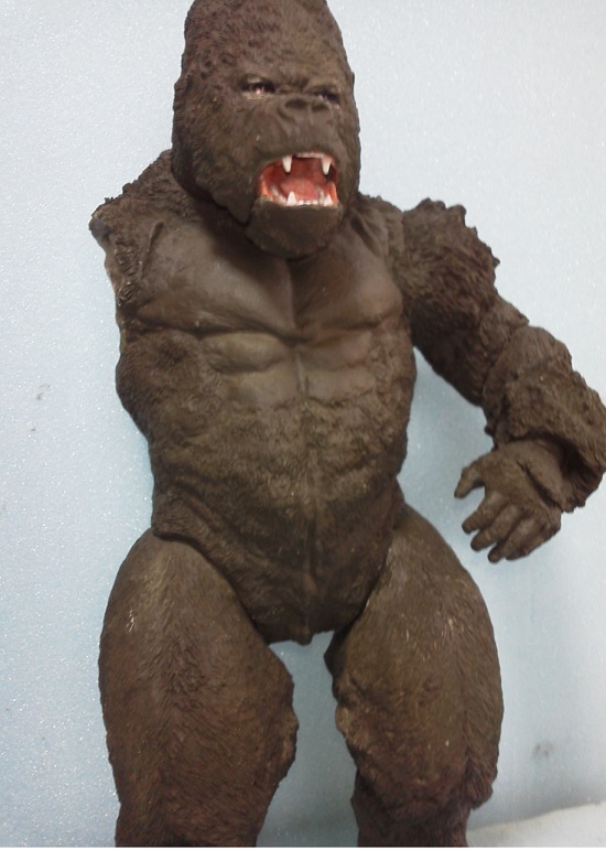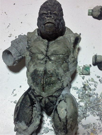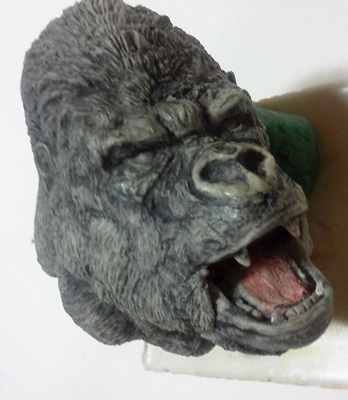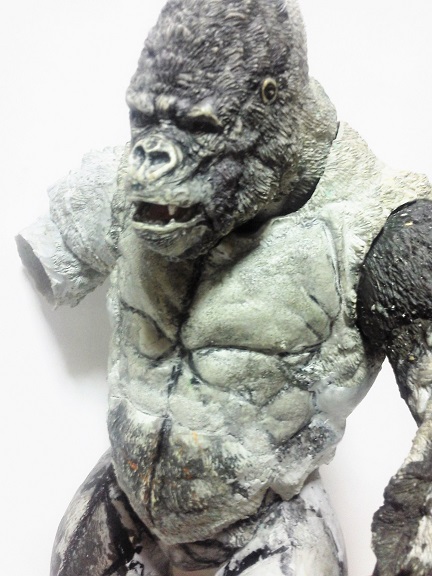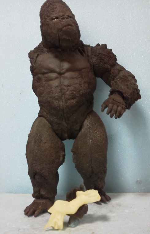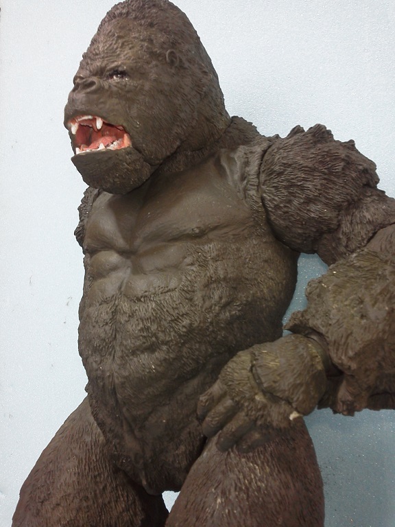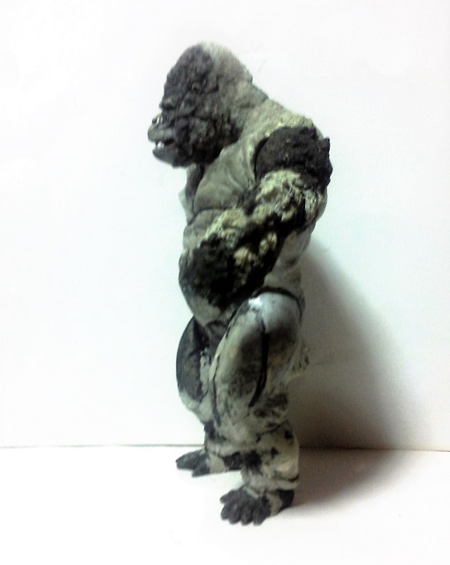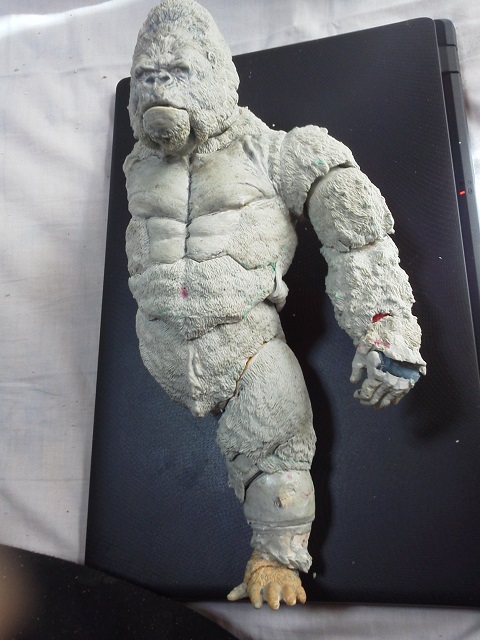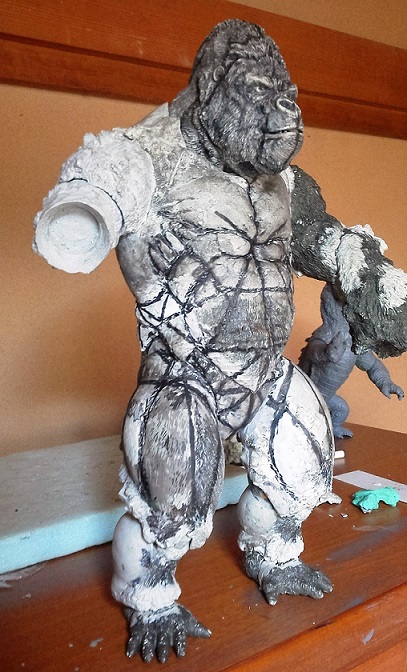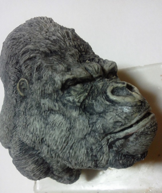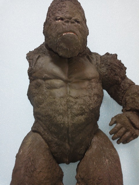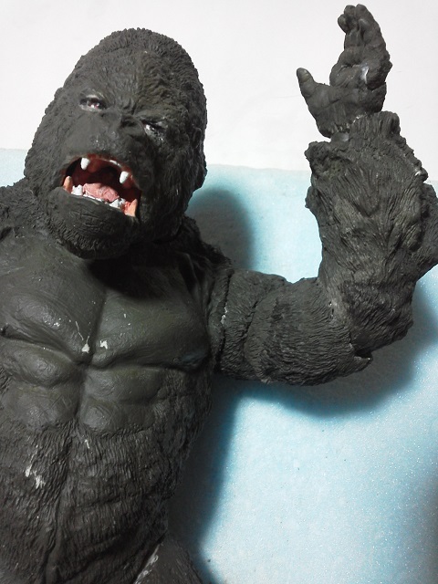 19:30追伸 「千年ゴリラ」現時点での全高32.5cm レジン→成形品を経ておよそ31cm程度の全高になるかと。 エクスプラス(原型協力 怪物屋)ギガンティックキンゴジでは流石に大きいか・・・ でもこのキンゴジ何気にかなり良い出来なんじゃないかと・・・ 2000ゴジより私はこっちが好きです!尻尾は?カタチ変えられるのかなぁ??? エクスプラスのギガンティックキンゴジ 全高48cm あみあみでまだ予約できるかも・・・ http://www.amiami.jp/top/detail/detail?scode=FIGURE-018640 販売価格 17%OFF33,800円(税込)予約※暫定 う~~ん・・・欲しいなぁ・・家宝にできても置き場所が・・・作業場所確保が最優先・・・ うぇ~~~~~んっ(←子供とおんなじ) では、しばしゴリラの体毛表現に(マジスカ無くなった・・・急ぎ注文した) 皆さんくれぐれもご心配無用ですからね♪ 8日15:30追記 暫くラストスパートにて更新おやすみ デッサンの最終確認終了。体毛表現と仕上げ作業に暫く集中しますね。 追記。おやすみ前の確認 やっぱ実際の原型はもう少し頭が小さい。首回りが仕上がれば多少かわるのかなぁ? 超人ハルクみたいな感じなんですけどね? 21:15追記 ここかぁ・・・ 骨盤がある。太腿の位置が上過ぎた・・・ 左横腹部とともに削りで形状改修。PCで拡大して確認。(また削ってらぁ!才能ねぇなぁ) 顔は頬と上口を若干修正。違いは一見班別できないだろう。 可動機構レベルの仕上げは、この彫刻レベルでの作業後に行う予定。 首は原型時ソケット部に収まらない(笑)現在首後部が欠けているのはそのため。 なにはともあれ、大きく見えていた顔はかなり改善。 まだ、前から見た際の横腹から脚に繋がるラインが気に入らない。 それでいて後頭部は少しづつ様子を見ながら大きくした。 頭蓋骨と首筋肉のしくみ、そして側面のボリュームが少しでも狂うと駄目。顔の部分は顎(エラ)を意識し首といっしょくたにならないようにした。やはり、頭蓋骨やら筋肉やらのしくみを理解しないと自然な可動も形状も容易にできないのがリアルに作る際の難しさ。 体は多少筋肉を強調し力強さを加えた。そして微妙に人間っぽい? やはり、私のイメージしている「キングコング」が「千年ゴリラ」の味付け(笑) 写真写りは相変わらず・・・・(苦笑) 次はとりあえず体毛をやってみよう。マジスカの薄皮を貼り体毛箇所による違いや強弱に留意。 尊敬する海外アーティストたちの作品を鑑賞し学んだ表現を試したい。 とにかくデカい・・・morinaoさんの「ふんばりゴジラ」と丁度良い大きさ。 もし、一般販売する際には当然量産金型(増し型)を使用するだろうから、 丁度良いスタンダードサイズにできるかも? 末期のウルトラ怪獣のガラモンなんか初版とくらべるとフタ回りほど小さくなってたっけ。 もっとも、私はやらない・・・販売させて欲しいと云う既得な御仁がおられれば 量産型用に成形品をお貸しして丸投げするだけ。 「利権」やら「金」やらが絡むともはやホビーに非ず。私にはビジネスの才は無い。(残念♪) 午前中、久しぶりにDavidとfbでチャット。 同時に東宝コングのBeto君からメッセージの嵐(笑)同時にやりとり。 Beto君曰く、名前使用は私の意図ではない。ロゴマークのメーカーさんの意向。 まぁ、何かあればDavidへのメッセージが保険になってくれるでしょう。 ※fbメッセージは投稿後の編集はできない。従って証拠として残るんです。 Beto君は私の知る限り純粋な古典怪物、東宝怪物のファン。 そして良い彫刻を完成させた彼との絶縁はこの際のやりとりによって保留・・・。 東京都の都知事さんのように「利権」やら「金」やらは簡単に人の心を呑込んでしまう。 最後は妖怪「ビビビのねずみ男」に人を変えてしまうのだ!(怖っ!) その根源にあるのは不公平な貧富の格差。 私が彼に願うことは一つ、「一流の彫刻家になることを願う、幸運を祈る」と彼にメッセージ。 これまで私から絶縁を決めたのは「ぽぉる君」と「英国怪物彫刻家君」だけ(笑) でも、私が絶縁されることはよくある(笑)(笑) 「ご自分の商売に巻き込むな、切らせてもらいます!」(直後メッセージ拒否扱いfb某御仁) 「これまでお世話になりました」早っ!?金ならぬモノの切れ目が縁の切れ目? その前に御免なさいは???ブコっ?おしまいなのね???・・・。(笑) コミュニケーション能力って・・・やっぱ大切かもです。 追記 いつのまにかカウンターアクセス数が300000超えてる・・・ 皆さんに只感謝。 でも数を見てもピンとこない。お金の勘定で私が理解できるのは¥300程度(笑) ¥300000・・・0の数が増えれば増えるほど目がチカチカするだけ・・・ 財布の中身?¥3000あれば日常たいていはコトがすむ。 それ以上¥30000?持ち歩くコト無い。 ¥300000?私の財布(小銭入れ)には入らない。 これを越えると¥3000000も¥30000000000も変わらない・・・ 0の数、数えられないしっ!!(爆笑) PR 15;00追記 摺合せ作業は今日で完了予定。