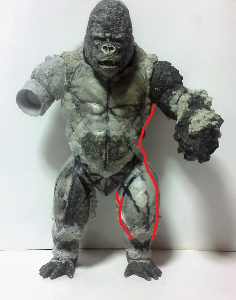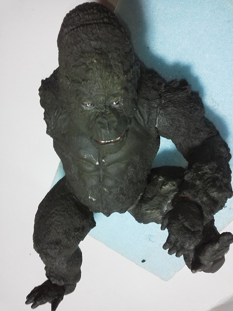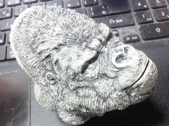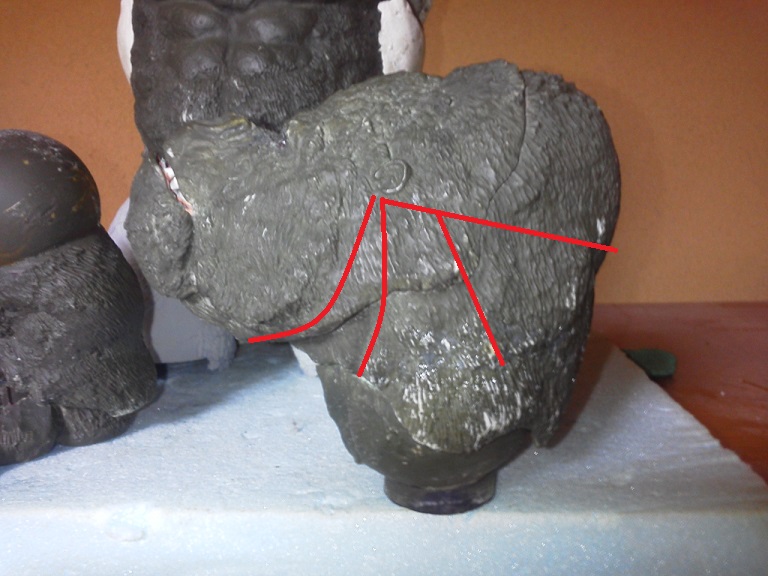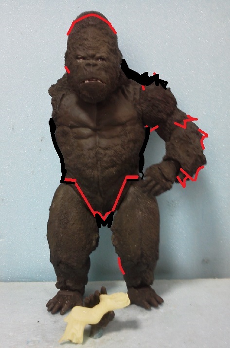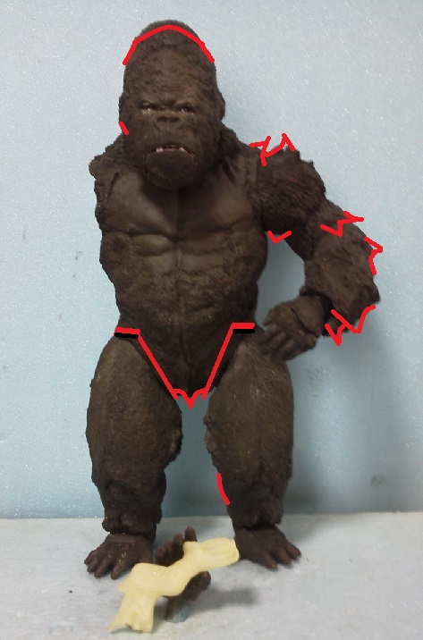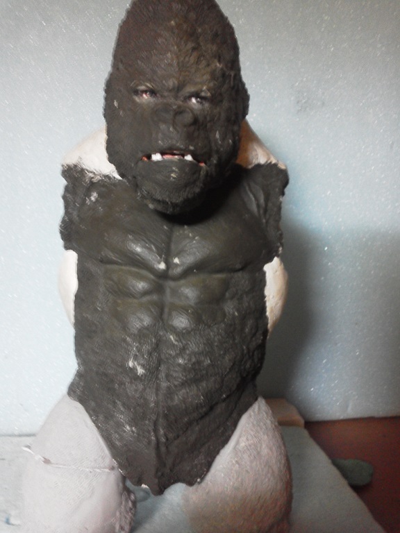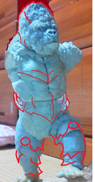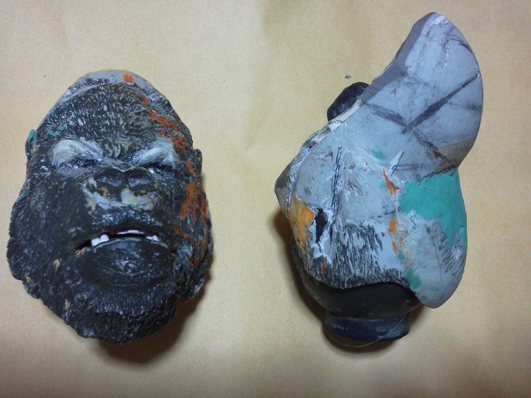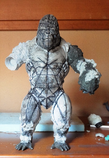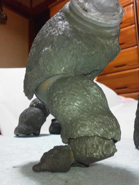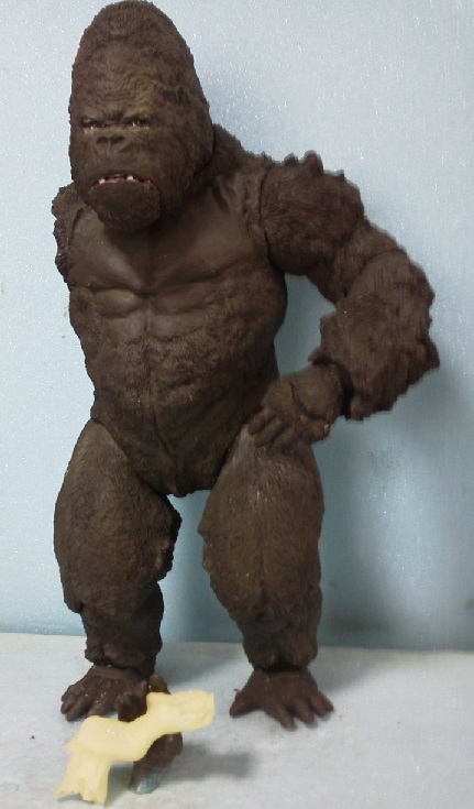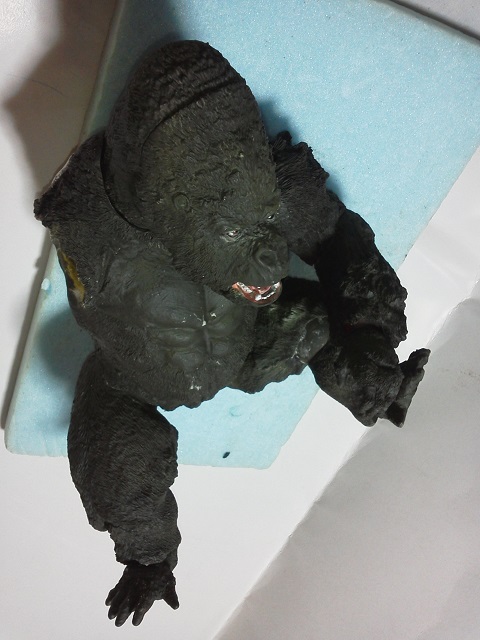 19:30追伸 「千年ゴリラ」現時点での全高32.5cm レジン→成形品を経ておよそ31cm程度の全高になるかと。 エクスプラス(原型協力 怪物屋)ギガンティックキンゴジでは流石に大きいか・・・ でもこのキンゴジ何気にかなり良い出来なんじゃないかと・・・ 2000ゴジより私はこっちが好きです!尻尾は?カタチ変えられるのかなぁ??? エクスプラスのギガンティックキンゴジ 全高48cm あみあみでまだ予約できるかも・・・ http://www.amiami.jp/top/detail/detail?scode=FIGURE-018640 販売価格 17%OFF33,800円(税込)予約※暫定 う~~ん・・・欲しいなぁ・・家宝にできても置き場所が・・・作業場所確保が最優先・・・ うぇ~~~~~んっ(←子供とおんなじ) では、しばしゴリラの体毛表現に(マジスカ無くなった・・・急ぎ注文した) 皆さんくれぐれもご心配無用ですからね♪ 8日15:30追記 暫くラストスパートにて更新おやすみ デッサンの最終確認終了。体毛表現と仕上げ作業に暫く集中しますね。 追記。おやすみ前の確認 やっぱ実際の原型はもう少し頭が小さい。首回りが仕上がれば多少かわるのかなぁ? 超人ハルクみたいな感じなんですけどね? 21:15追記 ここかぁ・・・ 骨盤がある。太腿の位置が上過ぎた・・・ 左横腹部とともに削りで形状改修。PCで拡大して確認。(また削ってらぁ!才能ねぇなぁ) 顔は頬と上口を若干修正。違いは一見班別できないだろう。 可動機構レベルの仕上げは、この彫刻レベルでの作業後に行う予定。 首は原型時ソケット部に収まらない(笑)現在首後部が欠けているのはそのため。 なにはともあれ、大きく見えていた顔はかなり改善。 まだ、前から見た際の横腹から脚に繋がるラインが気に入らない。 それでいて後頭部は少しづつ様子を見ながら大きくした。 頭蓋骨と首筋肉のしくみ、そして側面のボリュームが少しでも狂うと駄目。顔の部分は顎(エラ)を意識し首といっしょくたにならないようにした。やはり、頭蓋骨やら筋肉やらのしくみを理解しないと自然な可動も形状も容易にできないのがリアルに作る際の難しさ。 体は多少筋肉を強調し力強さを加えた。そして微妙に人間っぽい? やはり、私のイメージしている「キングコング」が「千年ゴリラ」の味付け(笑) 写真写りは相変わらず・・・・(苦笑) 次はとりあえず体毛をやってみよう。マジスカの薄皮を貼り体毛箇所による違いや強弱に留意。 尊敬する海外アーティストたちの作品を鑑賞し学んだ表現を試したい。 とにかくデカい・・・morinaoさんの「ふんばりゴジラ」と丁度良い大きさ。 もし、一般販売する際には当然量産金型(増し型)を使用するだろうから、 丁度良いスタンダードサイズにできるかも? 末期のウルトラ怪獣のガラモンなんか初版とくらべるとフタ回りほど小さくなってたっけ。 もっとも、私はやらない・・・販売させて欲しいと云う既得な御仁がおられれば 量産型用に成形品をお貸しして丸投げするだけ。 「利権」やら「金」やらが絡むともはやホビーに非ず。私にはビジネスの才は無い。(残念♪) 午前中、久しぶりにDavidとfbでチャット。 同時に東宝コングのBeto君からメッセージの嵐(笑)同時にやりとり。 Beto君曰く、名前使用は私の意図ではない。ロゴマークのメーカーさんの意向。 まぁ、何かあればDavidへのメッセージが保険になってくれるでしょう。 ※fbメッセージは投稿後の編集はできない。従って証拠として残るんです。 Beto君は私の知る限り純粋な古典怪物、東宝怪物のファン。 そして良い彫刻を完成させた彼との絶縁はこの際のやりとりによって保留・・・。 東京都の都知事さんのように「利権」やら「金」やらは簡単に人の心を呑込んでしまう。 最後は妖怪「ビビビのねずみ男」に人を変えてしまうのだ!(怖っ!) その根源にあるのは不公平な貧富の格差。 私が彼に願うことは一つ、「一流の彫刻家になることを願う、幸運を祈る」と彼にメッセージ。 これまで私から絶縁を決めたのは「ぽぉる君」と「英国怪物彫刻家君」だけ(笑) でも、私が絶縁されることはよくある(笑)(笑) 「ご自分の商売に巻き込むな、切らせてもらいます!」(直後メッセージ拒否扱いfb某御仁) 「これまでお世話になりました」早っ!?金ならぬモノの切れ目が縁の切れ目? その前に御免なさいは???ブコっ?おしまいなのね???・・・。(笑) コミュニケーション能力って・・・やっぱ大切かもです。 追記 いつのまにかカウンターアクセス数が300000超えてる・・・ 皆さんに只感謝。 でも数を見てもピンとこない。お金の勘定で私が理解できるのは¥300程度(笑) ¥300000・・・0の数が増えれば増えるほど目がチカチカするだけ・・・ 財布の中身?¥3000あれば日常たいていはコトがすむ。 それ以上¥30000?持ち歩くコト無い。 ¥300000?私の財布(小銭入れ)には入らない。 これを越えると¥3000000も¥30000000000も変わらない・・・ 0の数、数えられないしっ!!(爆笑) PR 15;00追記 摺合せ作業は今日で完了予定。