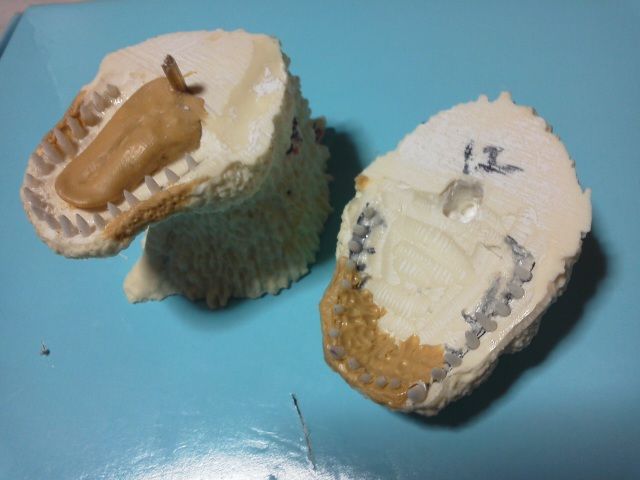 今日、頭部をノコギリで切断、下顎からノドまでを詰めた。そして再び頭部を2パーツで分割することに。