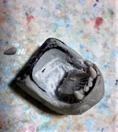 舌のかわりに歯並びに合わせてガイドを盛りマジスカ糸ミミズを切って前歯・臼歯に置いてヘラで整えるしかない・・・